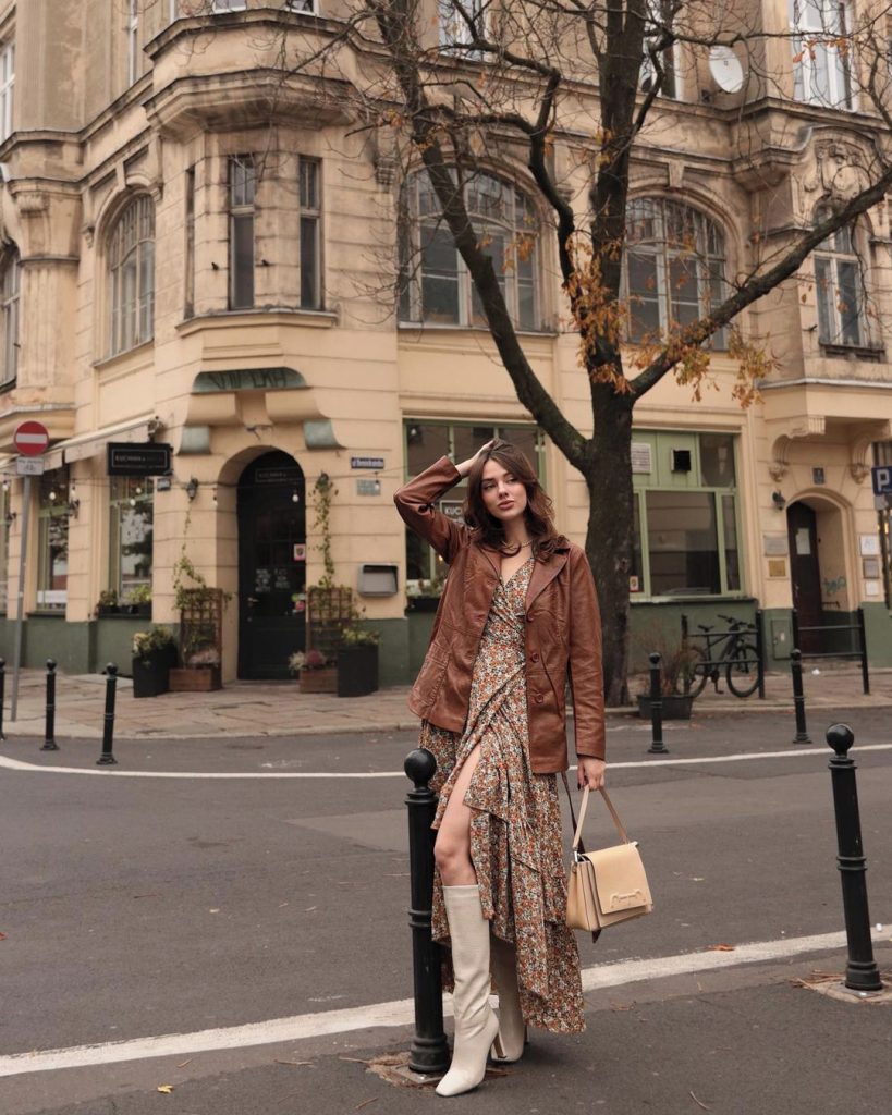 This outfit looks like it belongs on a street-style round-up from Paris or Warsaw—a blend of practicality and editorial flair. The key is the balance between the tough leather and the romantic dress. To personalize, consider a patterned scarf knotted at the neck or tied to the bag handle. I’d avoid overly dark tights; they might weigh down the fluid hemline. It’s perfect for office days, gallery visits, or crisp autumn weekends when the leaves match the print of your dress and you’re not ready to give up skirts to winter just yet.