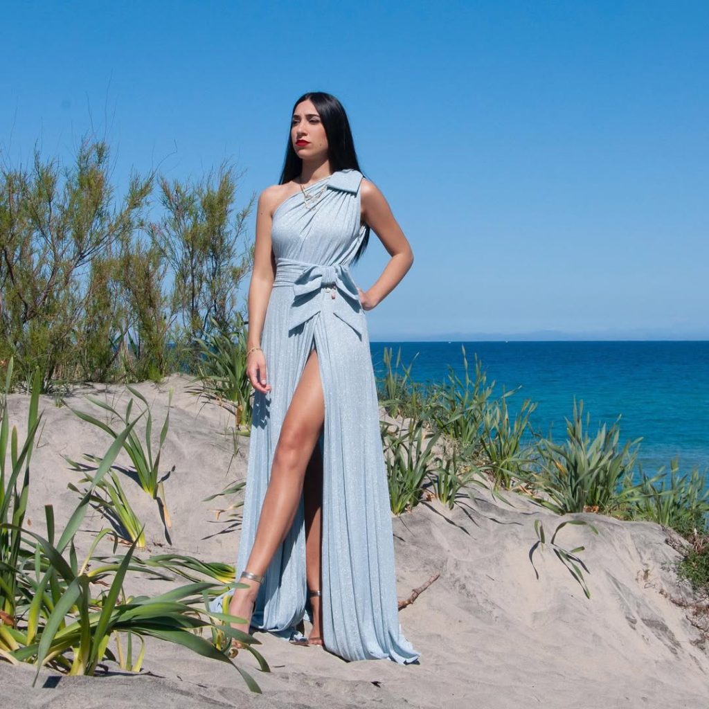 A slinky blue ruched gown with a daring slit glows under palm trees, pure “vacation party” energy in dress form.