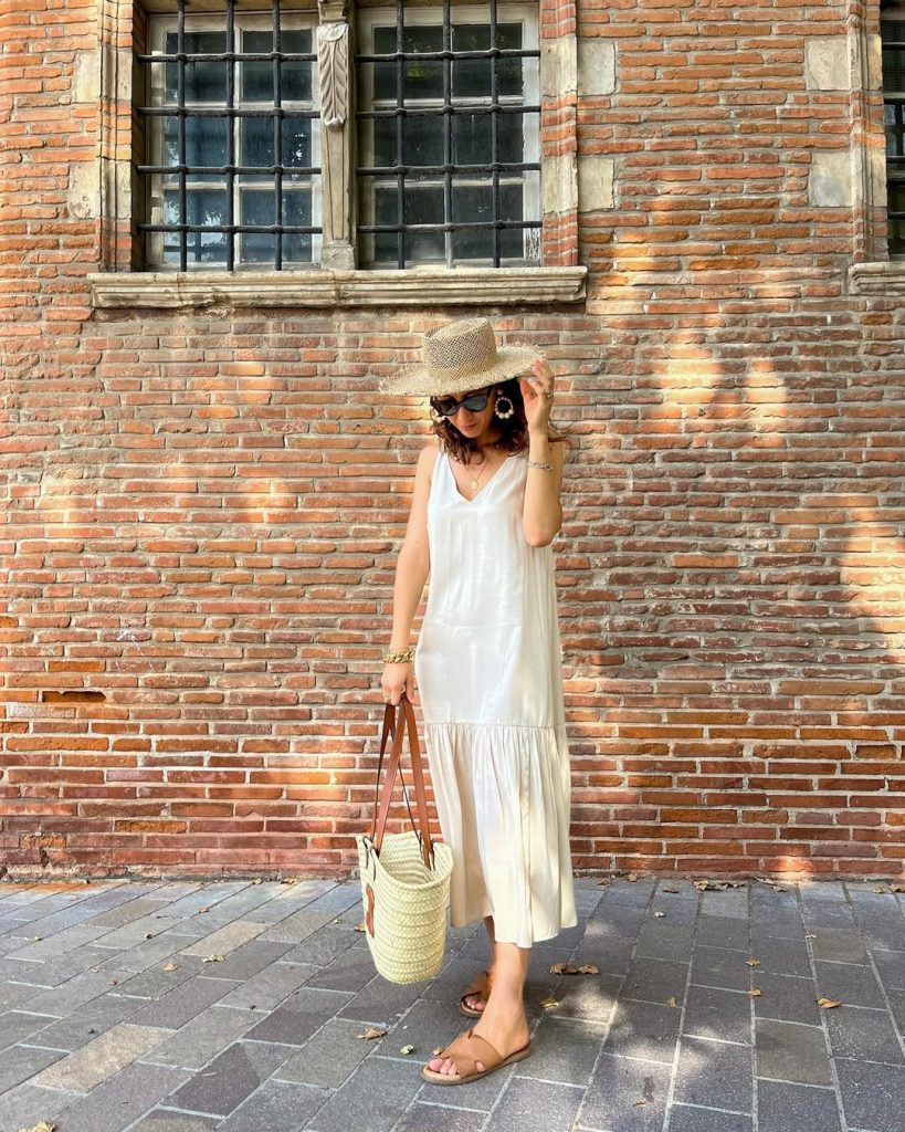 If you’ve ever spent a July afternoon wandering a European old town, you know this is the uniform. To add personality, tie a pink or green scarf around the bag handle or swap the slides for espadrille wedges for extra height. Skip heavy statement necklaces; they’d weigh down the neckline and compete with the earrings and hat. The style is perfect for summer vacations, outdoor lunches, or Sunday farmers’ markets when comfort and effortless polish need to coexist.