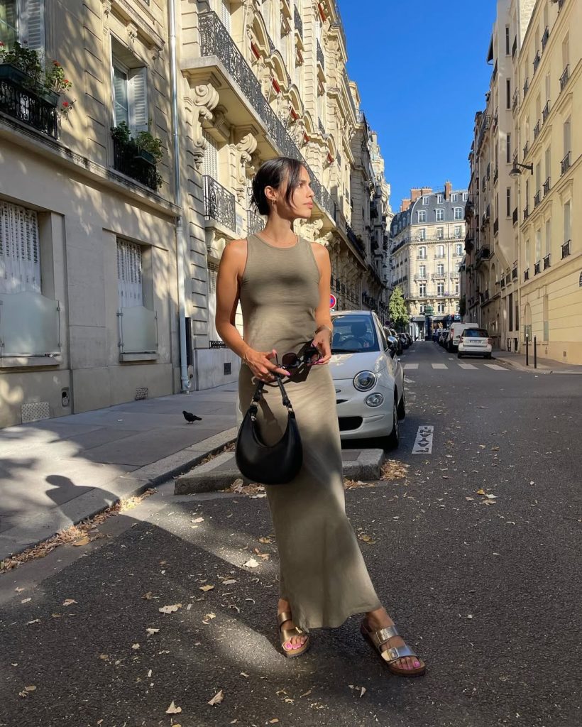 An understated khaki maxi hugs the body just enough, paired with metallic slides for a sleek bodycon-meets-street look.