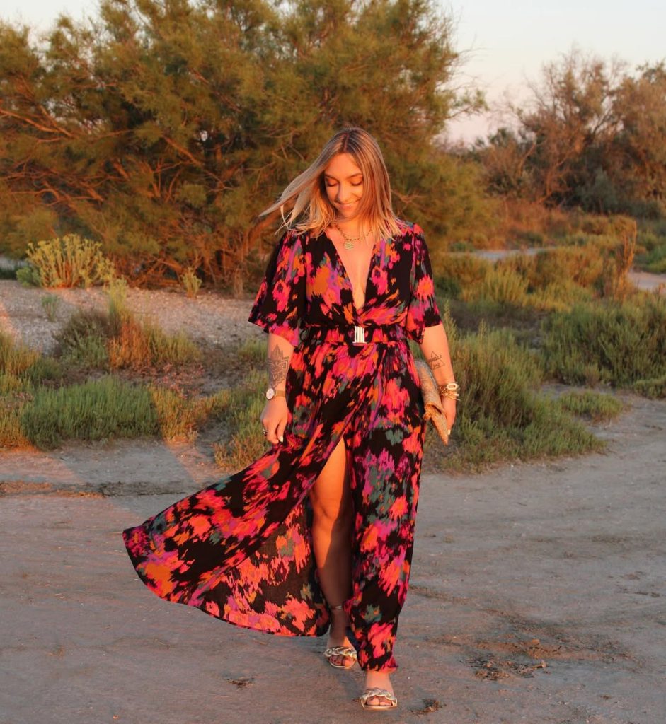 A floor-sweeping pink floral maxi, high heels, and woven tote make for a soft and romantic ensemble perfect for golden-hour selfies.