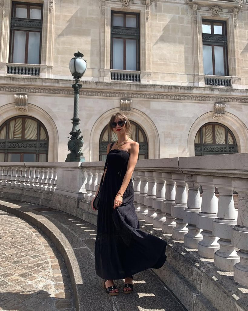 This is the kind of outfit that has Instagram comments asking, “Where did you get that dress?” It’s quietly sexy, perfect for warm fall days or urban summer evenings. To personalize, layer a cropped denim jacket or an oversized brown blazer when temperatures drop. I’d avoid fussy belts or loud prints; the appeal lies in the clean column of color. Wear it for terrace dinners, gallery visits, or long walks when you want to look intentional but still comfortably casual.