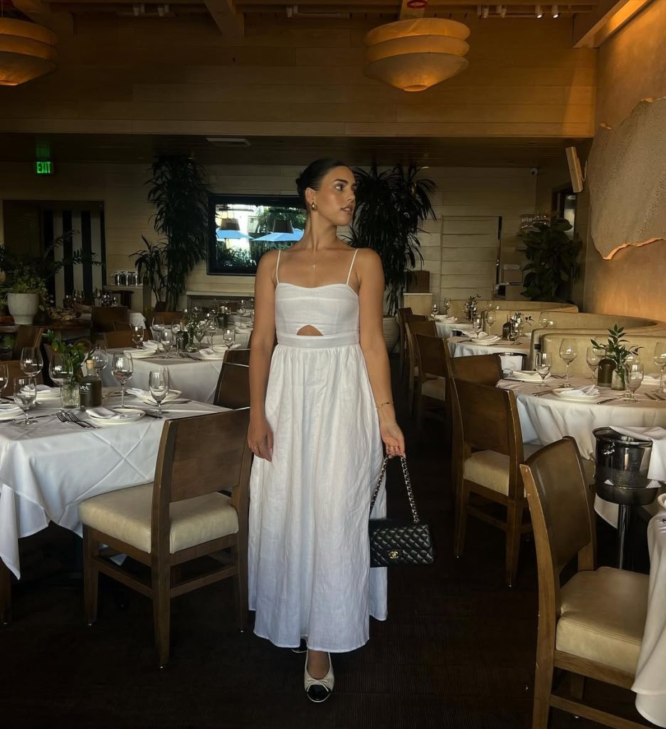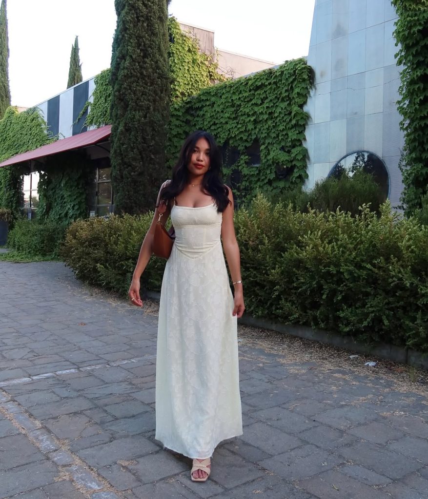 This look is made for an elegant party at a resort—birthday dinners, engagement toasts, or rooftop bars where the dress code leans glamorous. To add personality, play with a soft pink or coral lip and a loose wavy hairstyle; they’ll keep the vibe romantic rather than severe. I’d skip heavy jackets; if it’s breezy, drape a sheer shawl or a cropped white blazer so the ruched silhouette and cut-outs stay center stage.