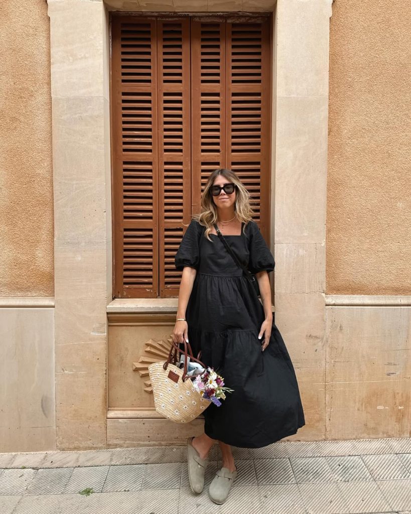 A billowy white shirt dress, straw tote, and suede clogs create a breezy uniform perfect for quiet courtyards and lazy vacation mornings.