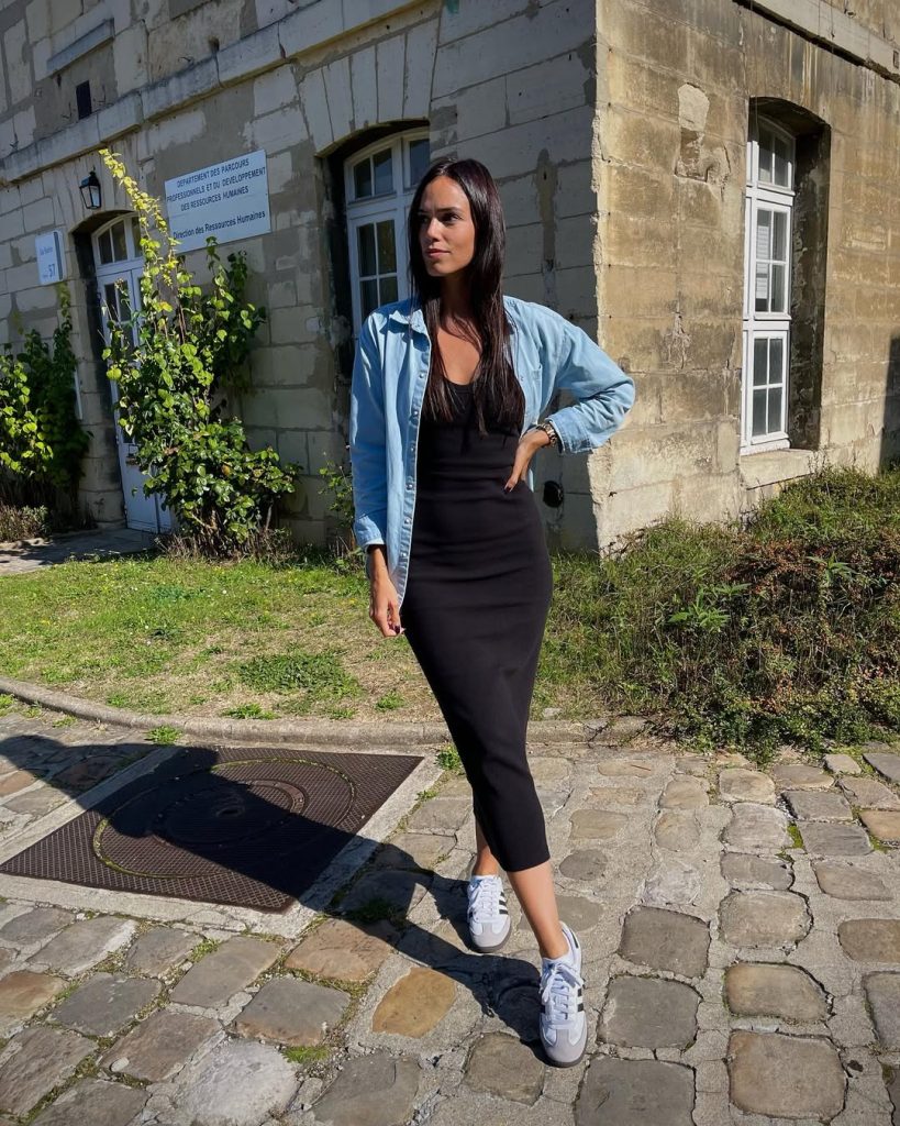 A fitted black midi and soft denim overshirt team up with sneakers for an effortless, off-duty city formula.