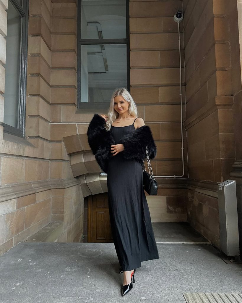 A sleek black maxi slip pairs with a plush faux-fur wrap, delivering serious old-Hollywood vibes for cold nights.