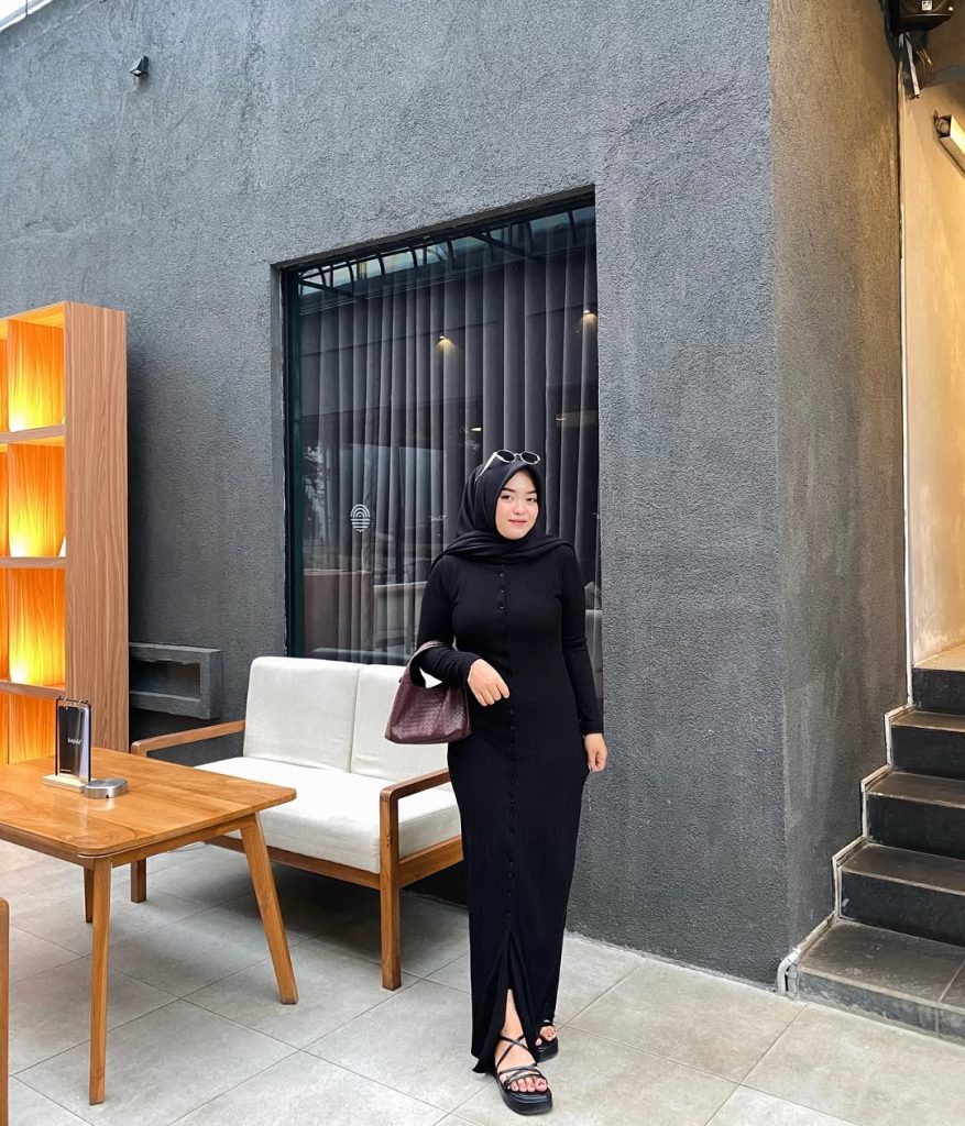 I often see similar silhouettes on Korean and Indonesian influencers who make modest style look impossibly cool. To add personality, stack thin gold rings or introduce a patterned scarf on the bag handle. Avoid overly bright sneakers, which might pull focus from the clean, vertical line of the dress. This outfit is perfect for coffee meetups, casual dinners, or even a relaxed office environment where you want both comfort and quiet power.