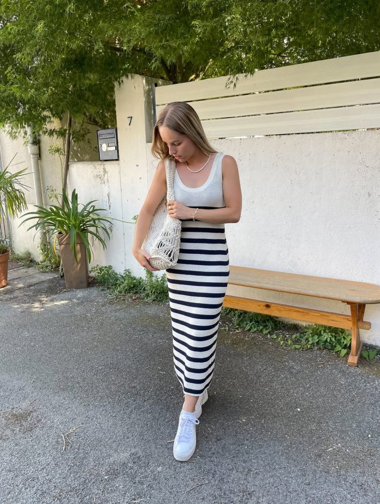 A striped tank dress and white sneakers tap into that nautical casual mood you want all summer long.