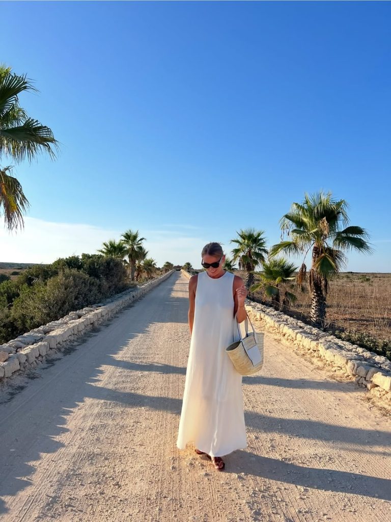 A sleeveless white maxi drifts down a palm-lined dirt road, capturing the quiet magic of late-afternoon summer light.