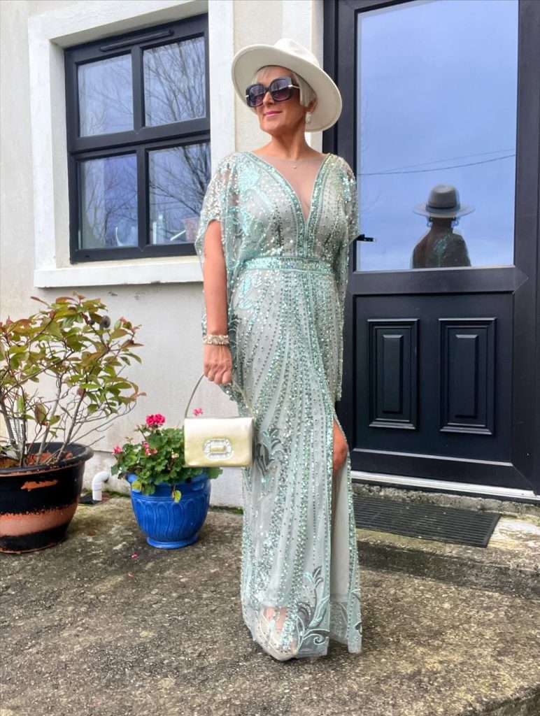 A beaded green-mint gown, wide-brim hat, and sunglasses prove that glamour doesn’t have an age limit—it just gets more confident.