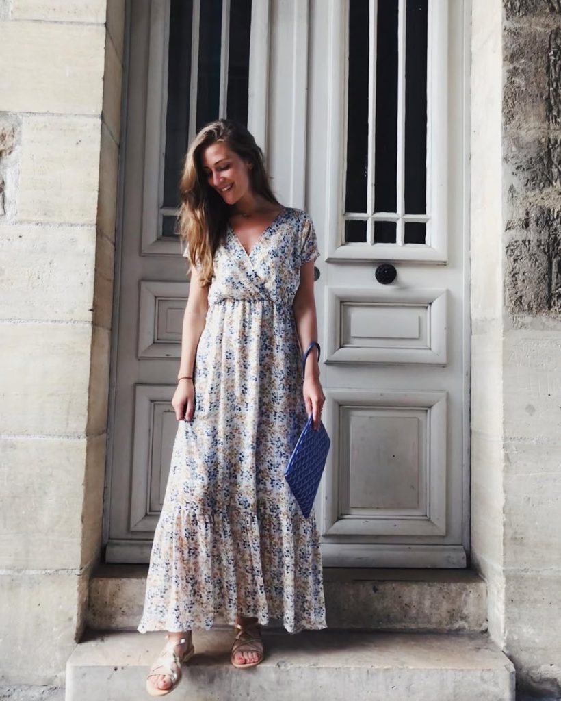 A light wrap dress dusted with tiny blooms, paired with flats and a blue clutch, feels effortlessly summer-ready.
