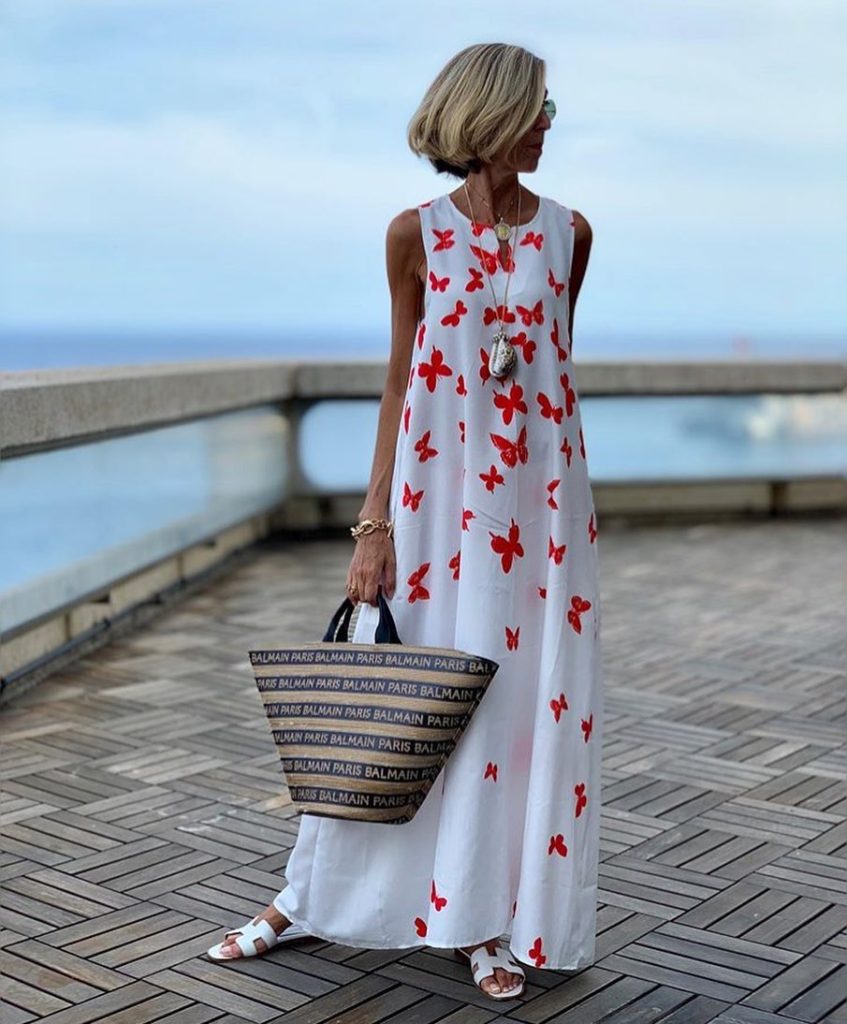 This is vacation confidence in clothing form. The print does the talking, so I’d add only delicate earrings or a slim watch rather than oversized jewelry. A bright lip in a matching red pulls the look together; heavy eye makeup would feel out of sync with the breezy vibe. Think seaside brunches, harbor walks, or an elegant party at a beach club where the dress code is “effortless but impressive.” It’s also a smart option for hot summer days when you want air circulation and maximum impact.