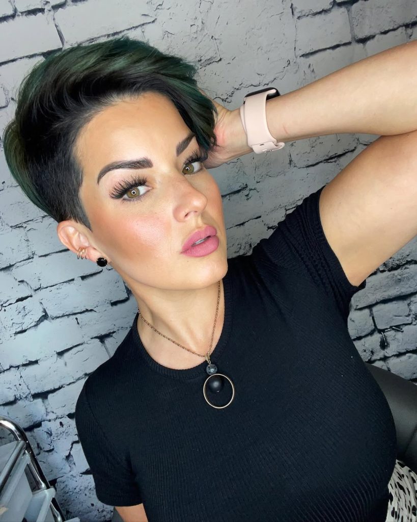 This edgy long pixie brings contrast into play, combining longer, textured top layers with closely cropped sides. The result feels bold but intentional—never messy.