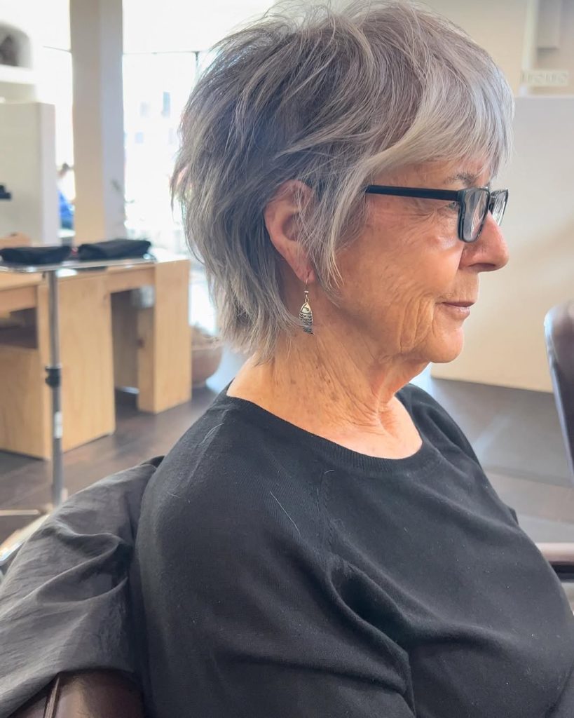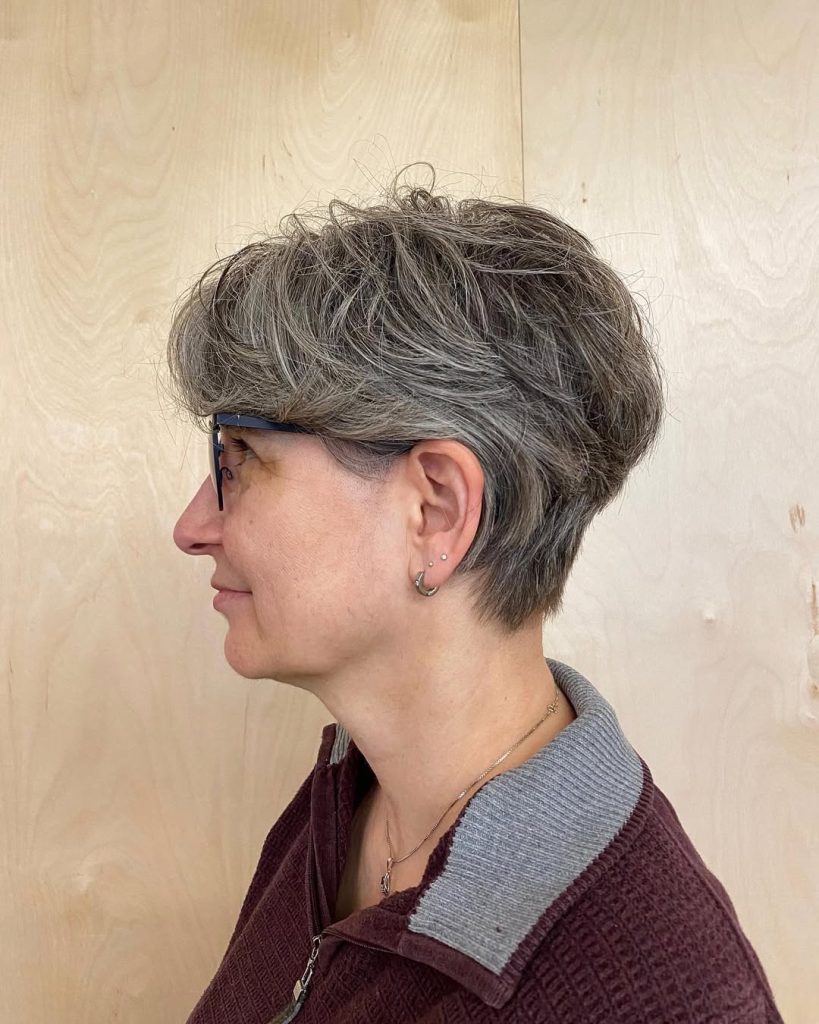 This long pixie celebrates natural gray tones with intention rather than compromise. The softly layered crown creates lift, while the clean, tapered nape keeps the profile elegant and modern. It’s a strong example of how a long pixie can feel fresh and confident over 50, especially for women embracing their natural color journey in 2026.