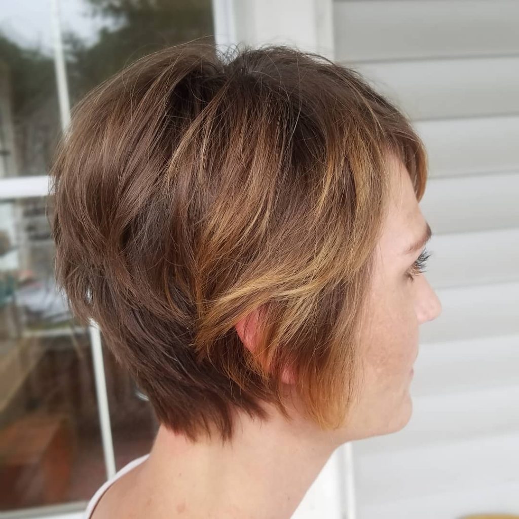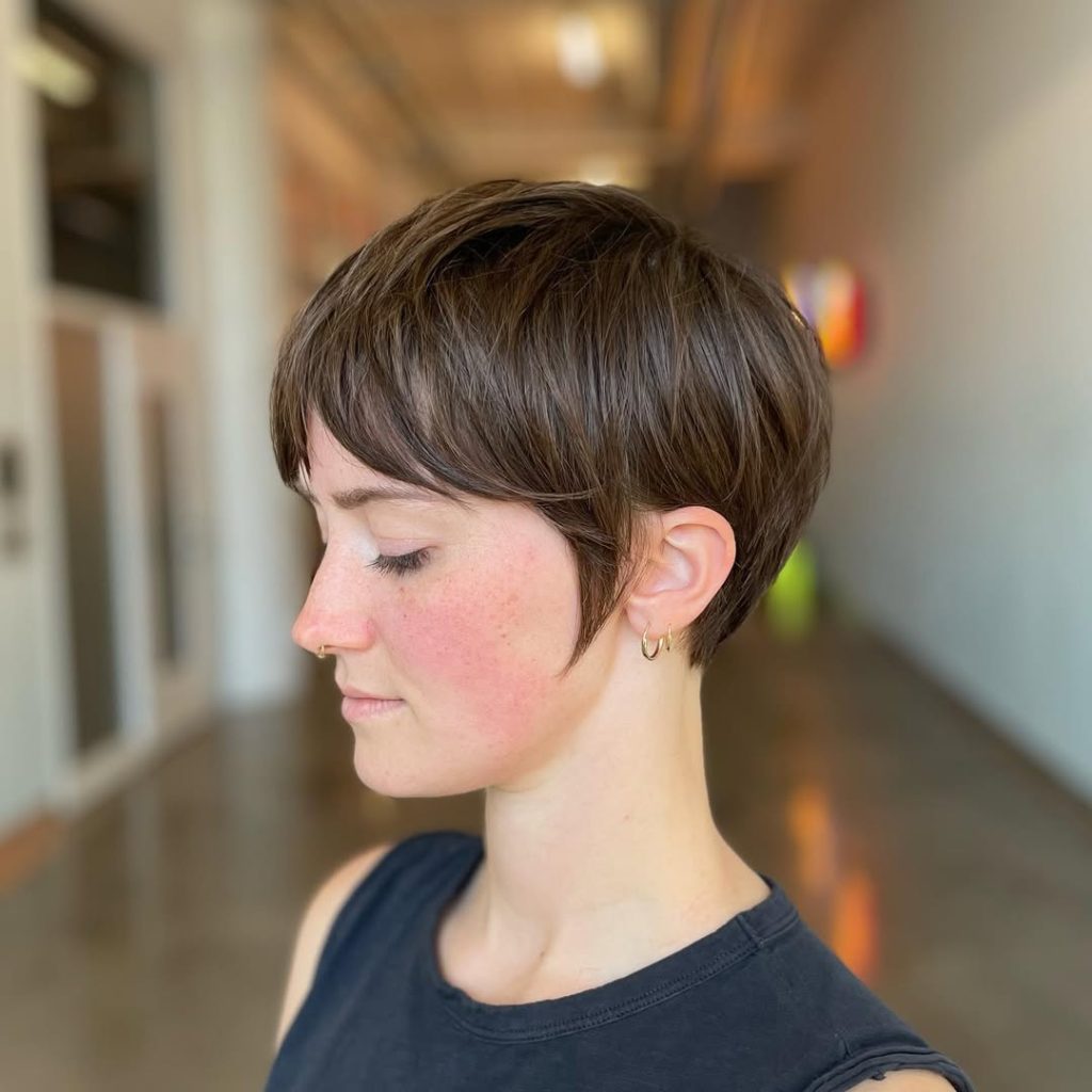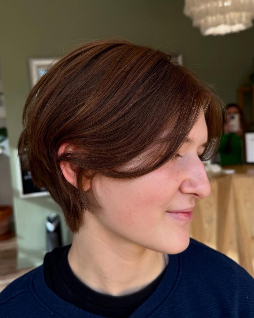 This long pixie uses warm tones and face-framing layers to create depth and dimension. The subtle layering around the temples softens facial features, while the longer top adds flexibility in styling.