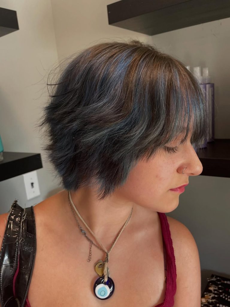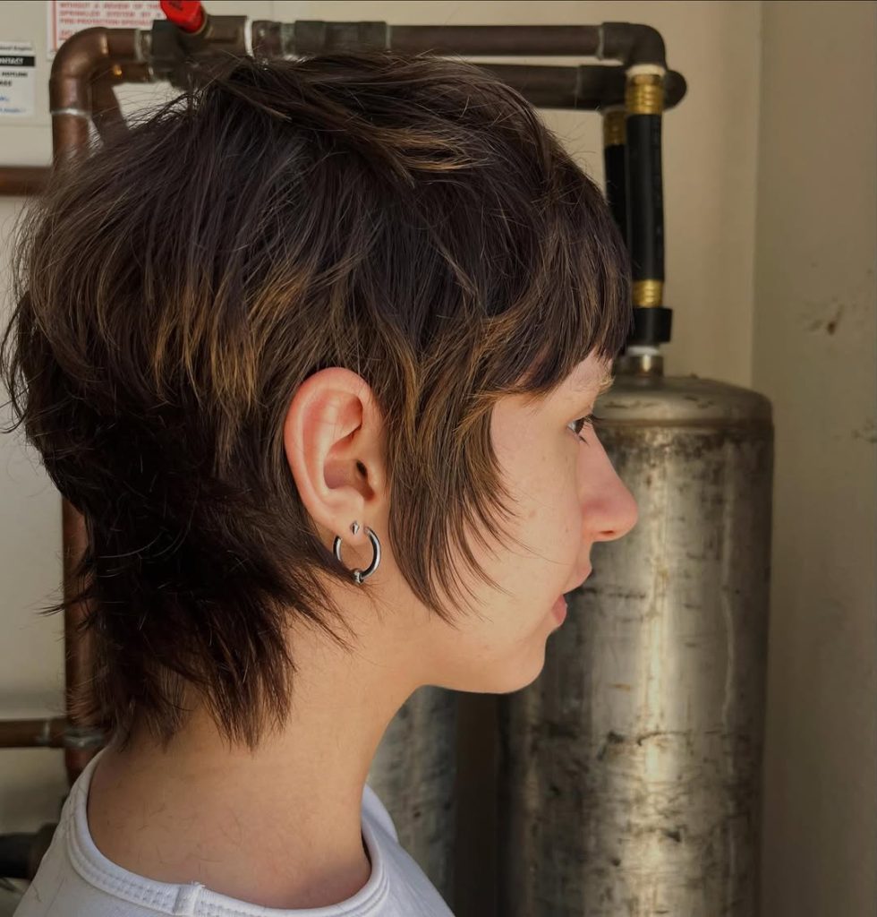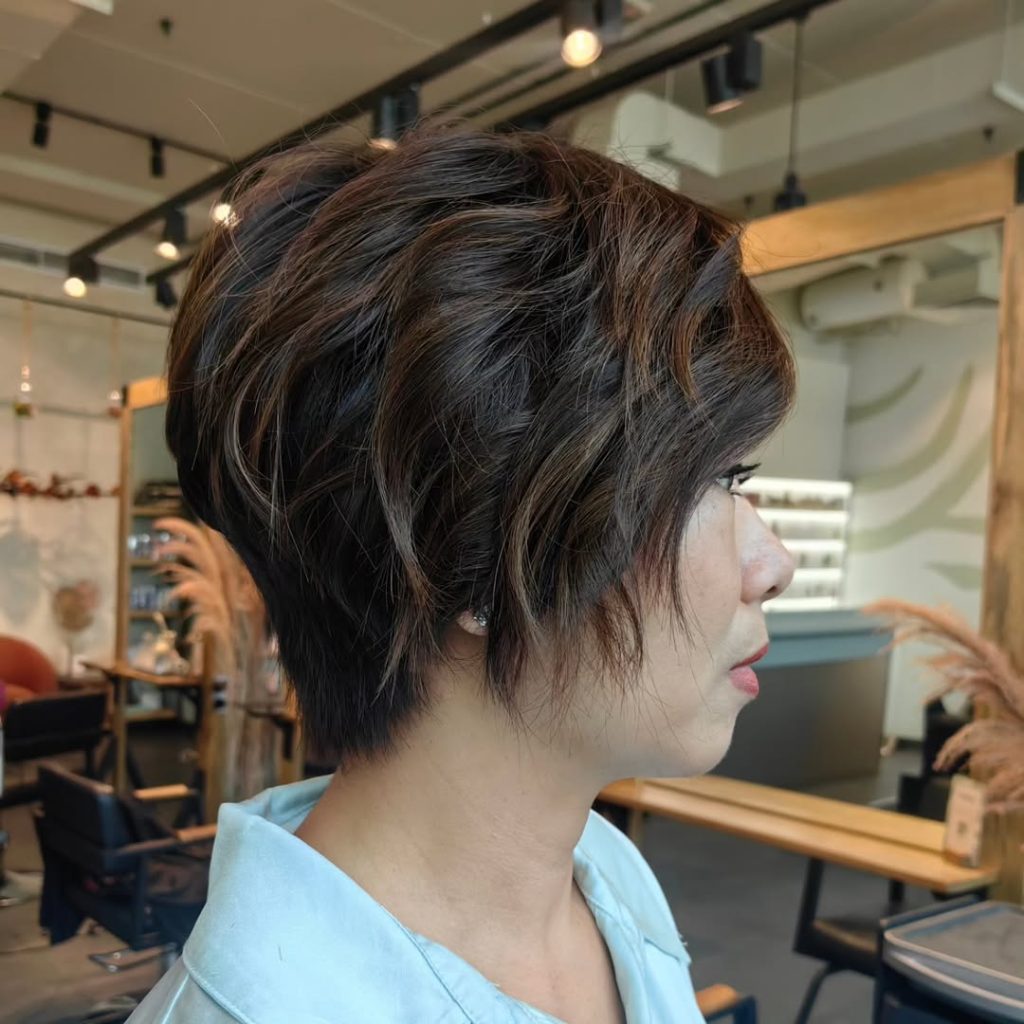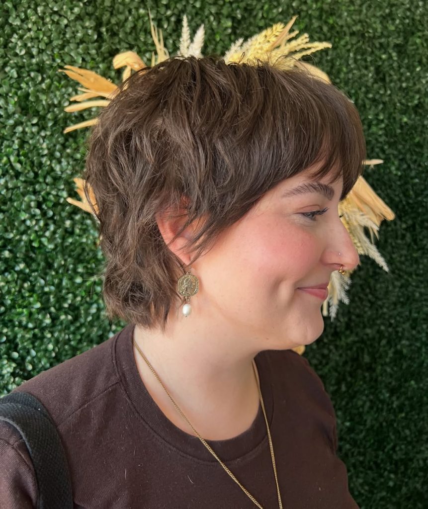 This long pixie uses warm tones and face-framing layers to create depth and dimension. The subtle layering around the temples softens facial features, while the longer top adds flexibility in styling.