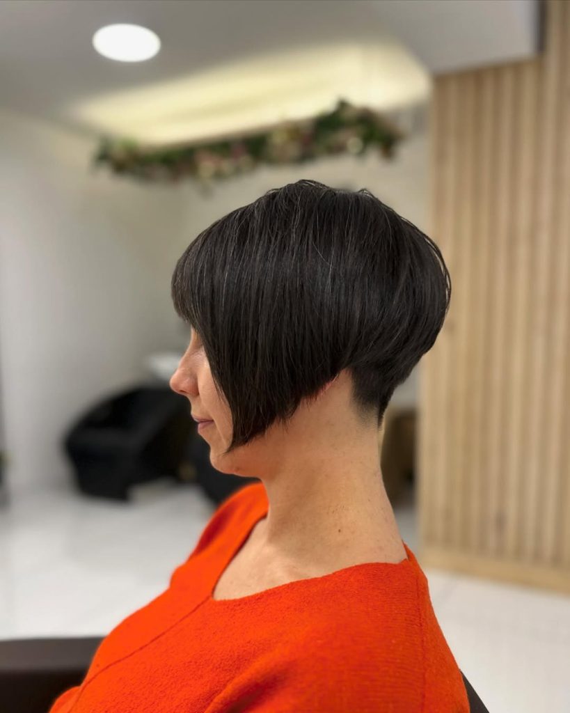 This cut combines a shorter, neatly shaped back with a lifted crown, creating a flattering profile from every angle. It works especially well for thick hair, where structure is key to preventing bulk.