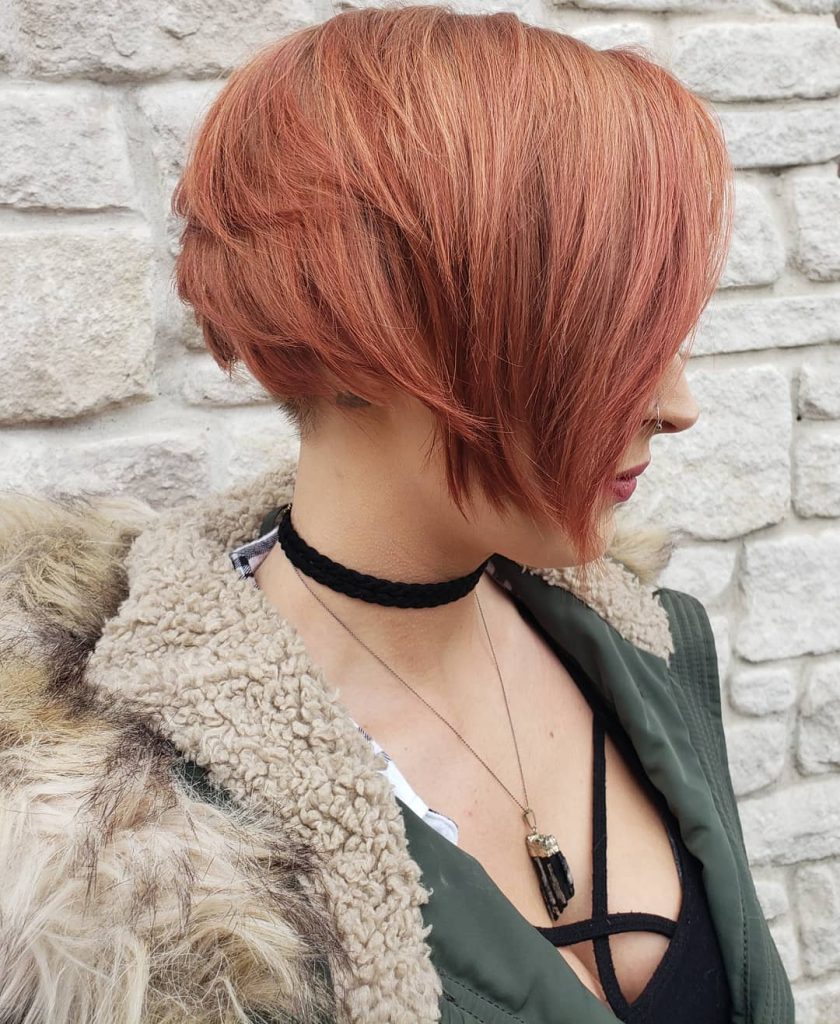 Rich copper tones paired with bangs give this long pixie a bold yet wearable personality. The side-swept fringe draws attention to the eyes and cheekbones, making it especially flattering for round faces and heart-shaped profiles.
