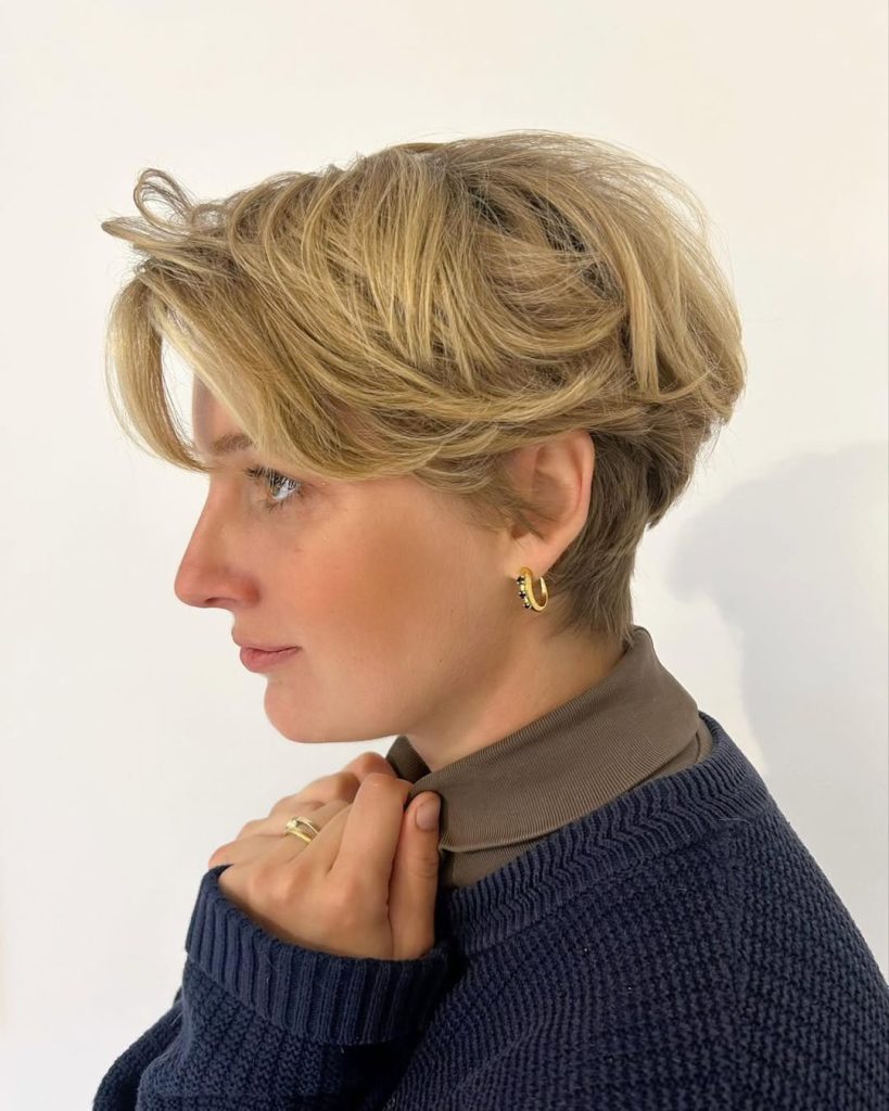 It’s a reminder that long pixie styles don’t need dramatic contrast to feel modern. This approach feels relaxed, wearable, and quietly sophisticated—perfect for women who want polish without daily styling stress.