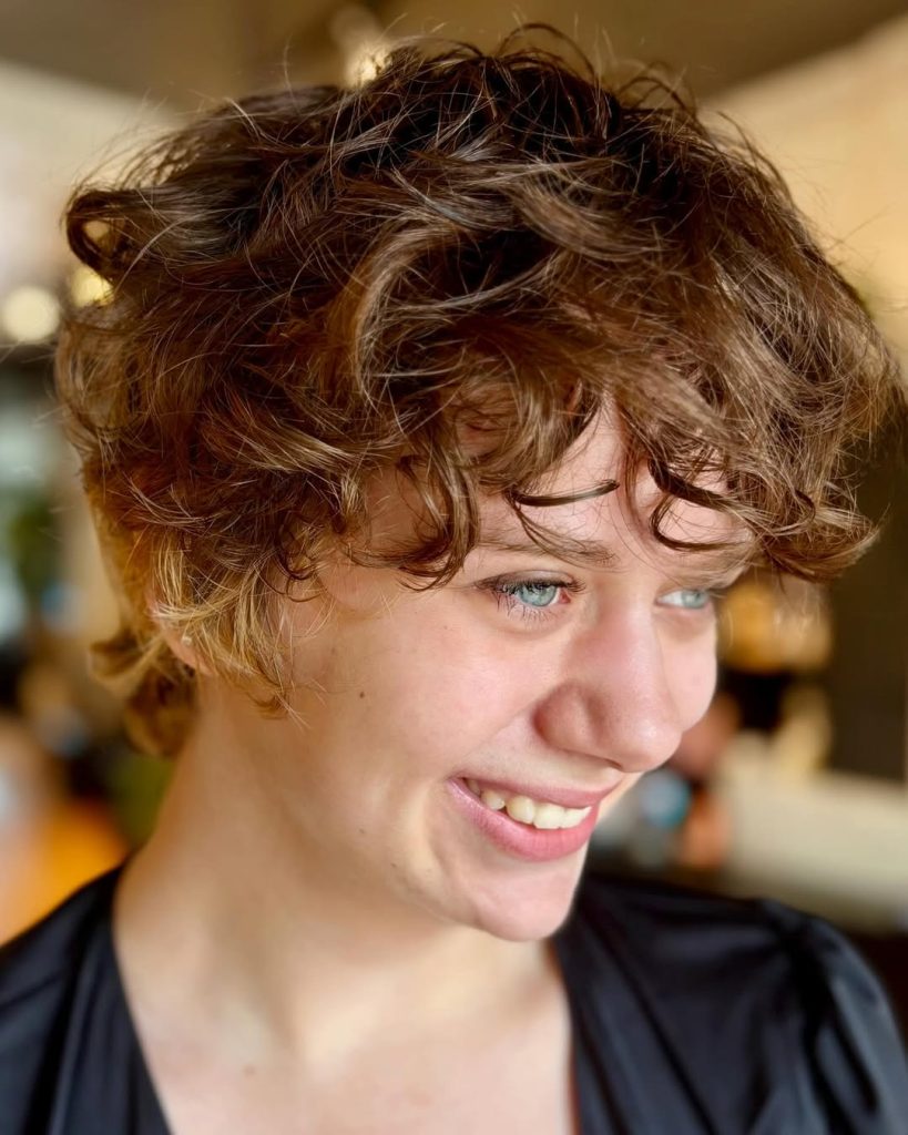 This long curly pixie fully embraces natural texture, allowing curls to create shape and volume on their own. The slightly longer top keeps the curls soft and touchable, while the shorter sides maintain balance and prevent bulk.