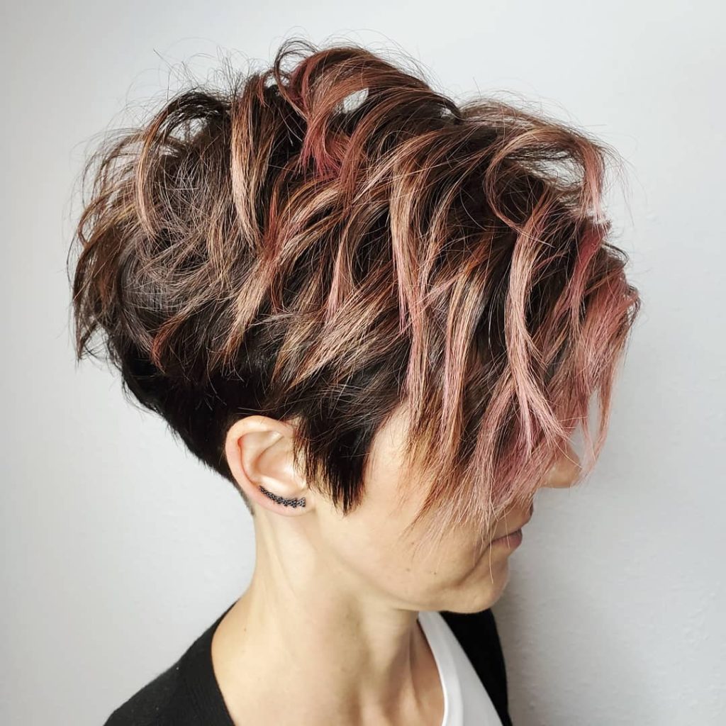 This version proves how transformative color placement can be on a long pixie haircut. The warm, sun-kissed highlights add depth and visual movement, which is especially helpful for thinning hair or naturally straight hair that tends to lie flat.
