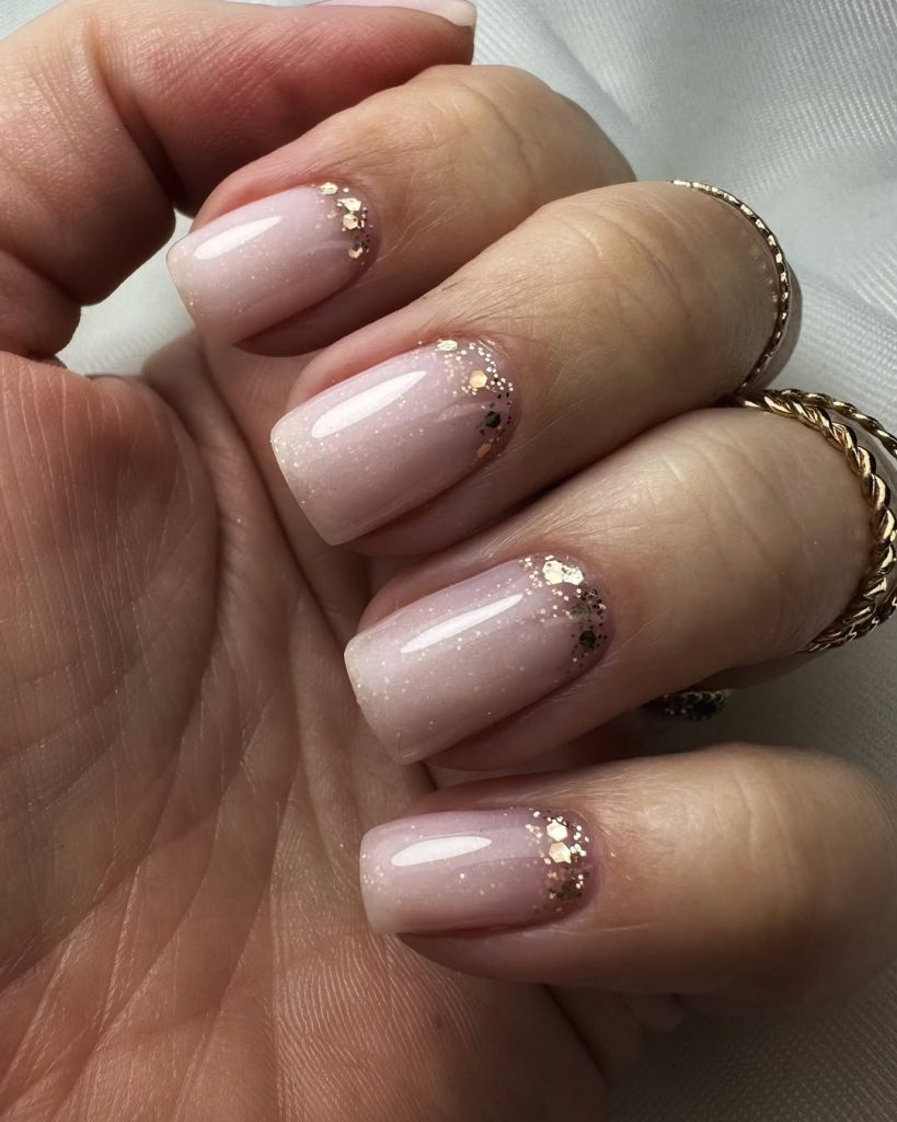 Old money doesn’t mean avoiding sparkle—it means knowing where to place it. These square nails feature a blush-toned base with barely-there glitter accents near the cuticle, adding interest without overpowering the look. This understated shimmer feels ideal for winter evenings or Christmas events when you want polish that catches light subtly. The structure remains clean and wearable, proving that tasteful embellishment still belongs in the old money aesthetic when done with intention.