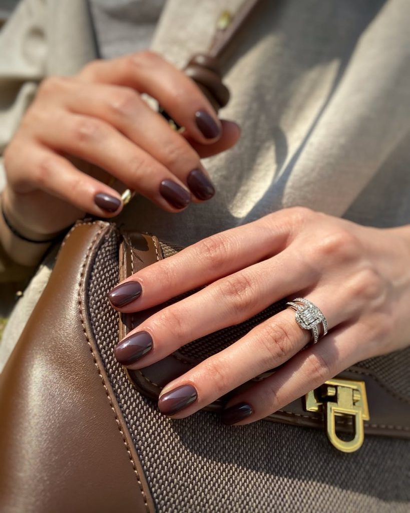 Rich chocolate brown nails bring a grounded, intellectual elegance that feels especially relevant for fall. Kept short and glossy, this manicure pairs beautifully with wool coats, leather handbags, and muted autumn palettes. Dark neutrals like this have become a quiet power move in 2026, favored by women who want something bold without being flashy. This is a color that communicates confidence—the kind that doesn’t need explanation—and works just as well for professional settings as weekend styling.