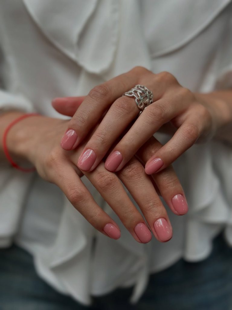 These softly rounded, rosy nails strike a perfect balance between natural and refined. The color adds warmth to the hands without overpowering them, making this manicure incredibly wearable. Kept short, it feels practical and timeless—ideal for women who want elegance that fits seamlessly into real life. This style works year-round but feels particularly fitting for spring and summer, when lighter, healthier-looking nails feel most relevant.
