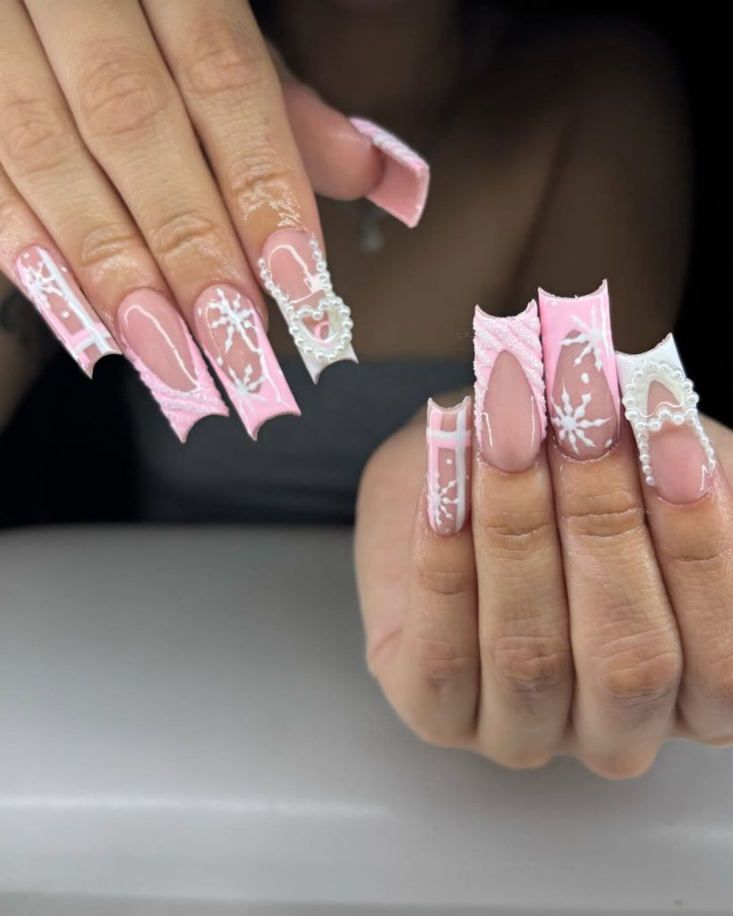 Architectural yet romantic, this set mixes blush blocks with cut-away arches, piped white lace, and micro pearls. Carved crescent edges feel edgy-sweet (the energy every editor calls the “soft-grit” mood for 2026). The palette is unmistakably light, but the structural carving keeps it anything but simple.
