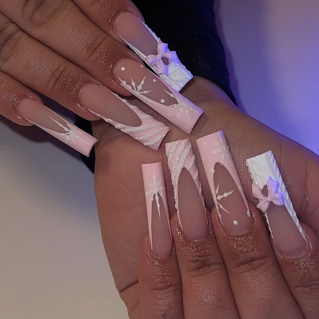 A cozy-glam moment: cable-knit embossing meets satin-pink panels and crisp white accents. Snowburst striping elongates the nail, while tiny bows keep it playful. It’s après-ski chic for city life.