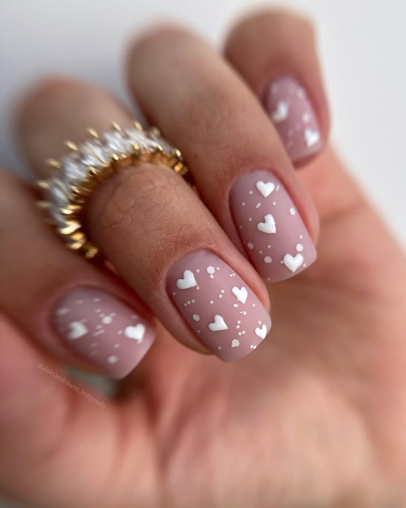Proof that short nails can still be crush-worthy: a soft café-rose base topped with scattered white hearts and micro dots. The velvet-matte finish modernizes the sweetness.