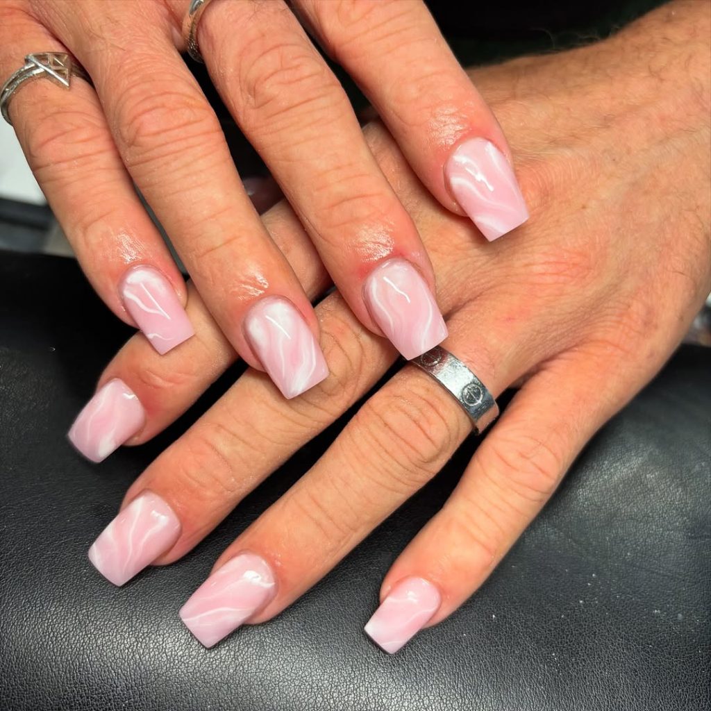 Short, glossy, and secretly drama-filled. Subtle white marble patterns ride blush pink on a tight square shape. It’s the minimalist’s version of nail art—professional enough for a boardroom presentation but show-stopping enough for a dinner date.