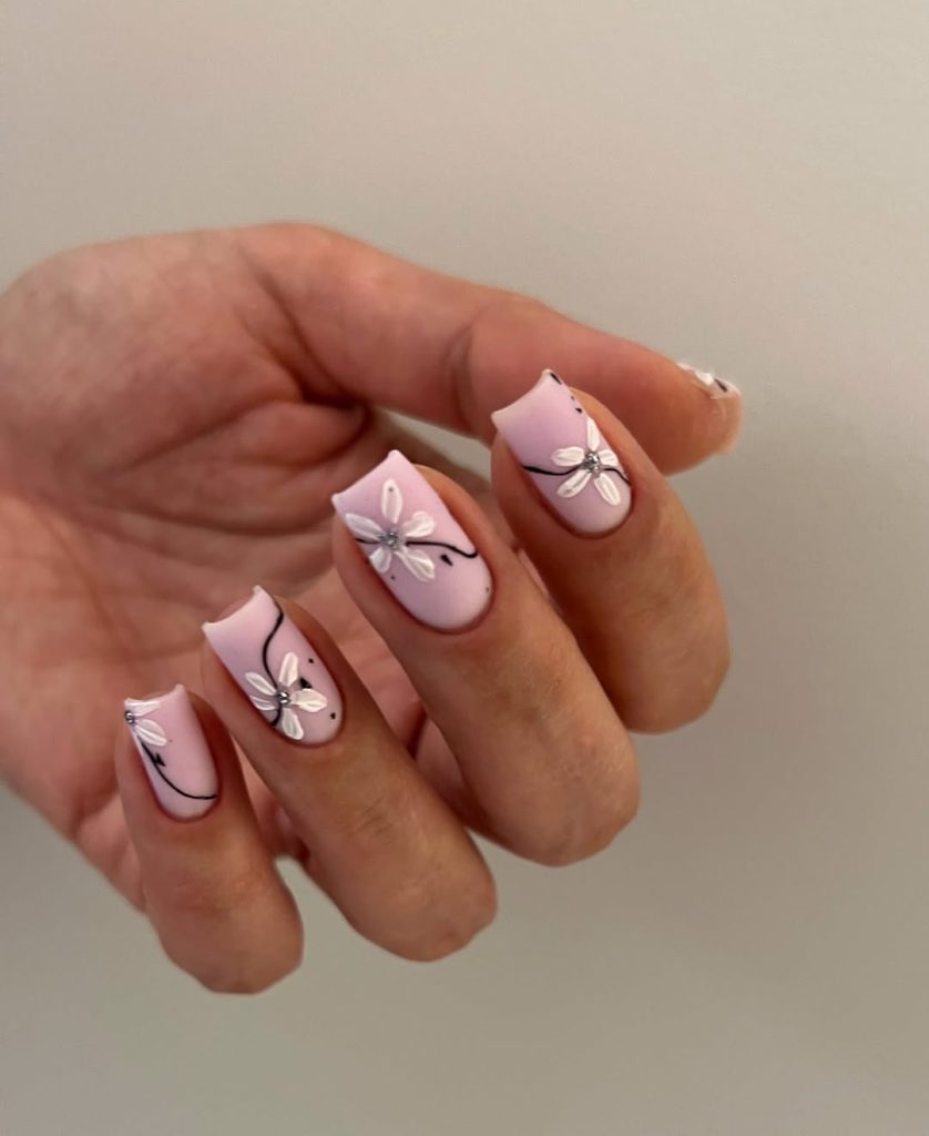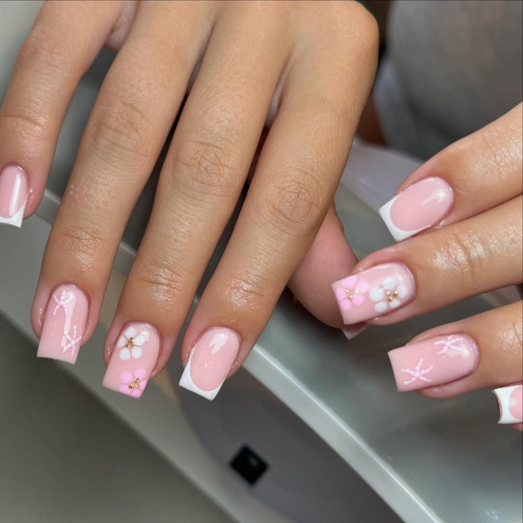 Glossy pink bases and bold white tips, then one accent nail covered in tiny blush blossoms dotted with gold studs. The elongated square reads editorial, while the palette keeps it soft.