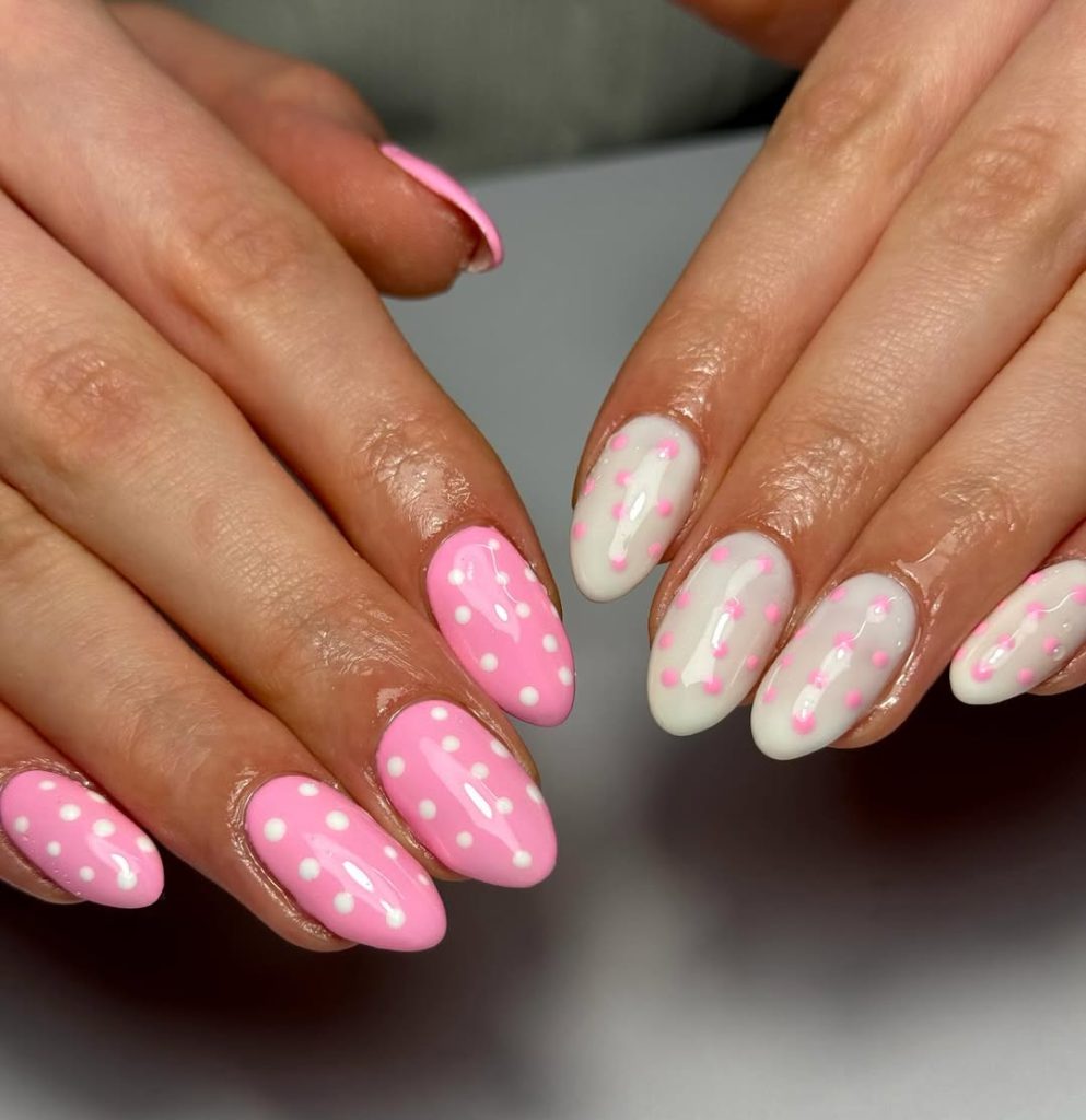 Playful without being precious, this glossy almond set alternates cotton-pink and soft white with raised dot trails—a subtle, tactile design that reads “cute” and “upbeat.” The medium length keeps it wearable for typing and workouts, while the rounded almond tip of the nails elongates the fingers.