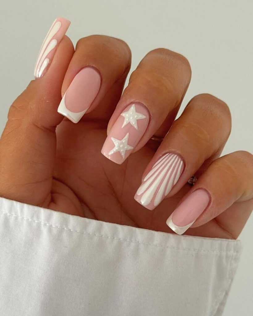 Pink bases have reached their sweet cleaning peak with pure white smirks on top of select tips. Others display embossed stars and rays. The angled square tip keeps white details ultra-modern.