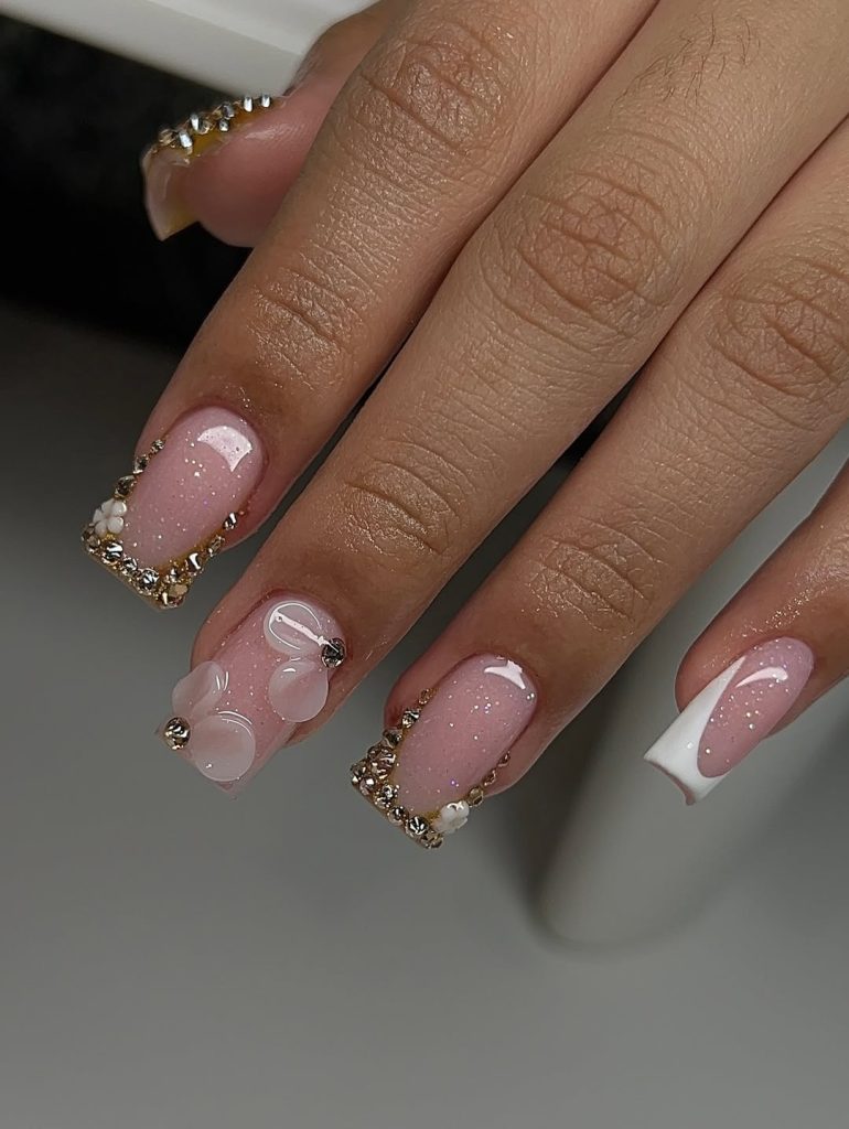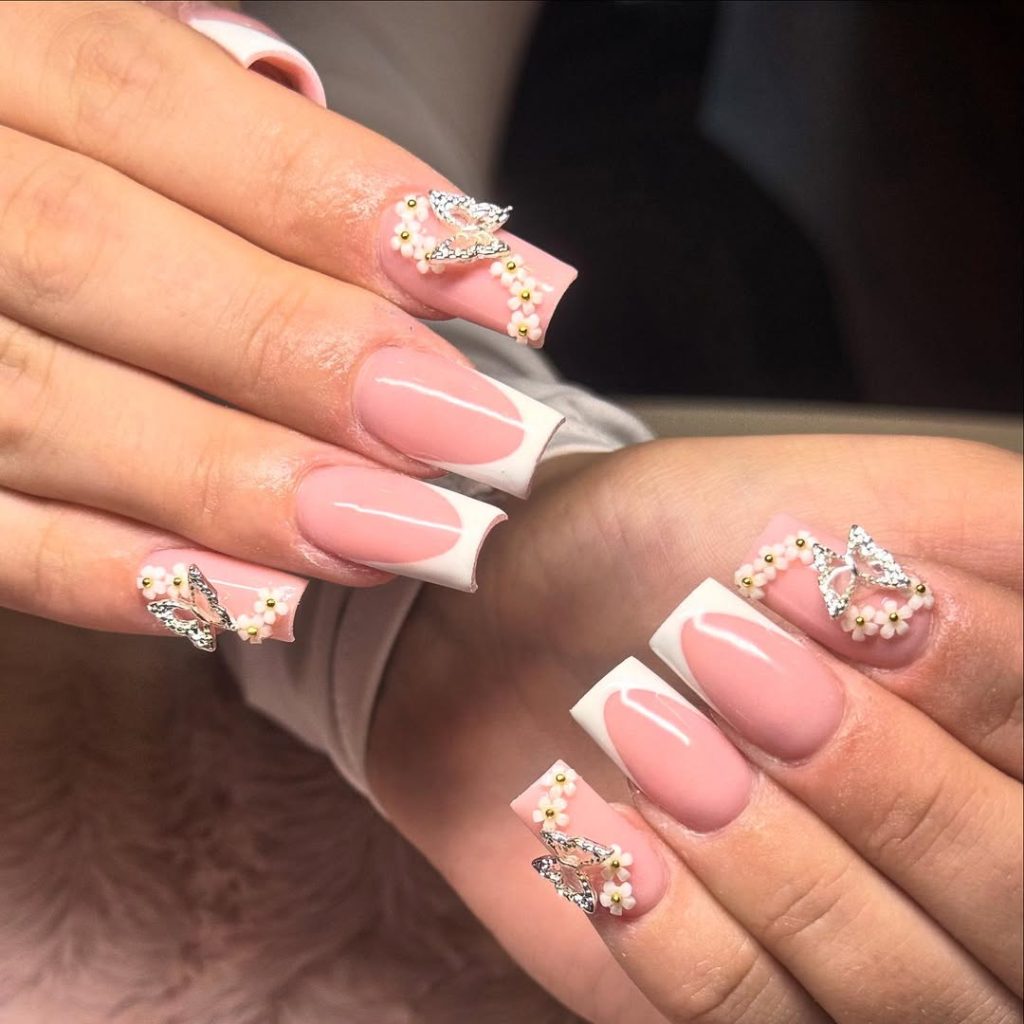 A glossy pink base with sculpted white tips gets a party-ready upgrade: crystal-lined butterflies and tiny floral pearls drape across select nails. The squared length is camera-friendly and durable, ideal if you’re rough on your hands.