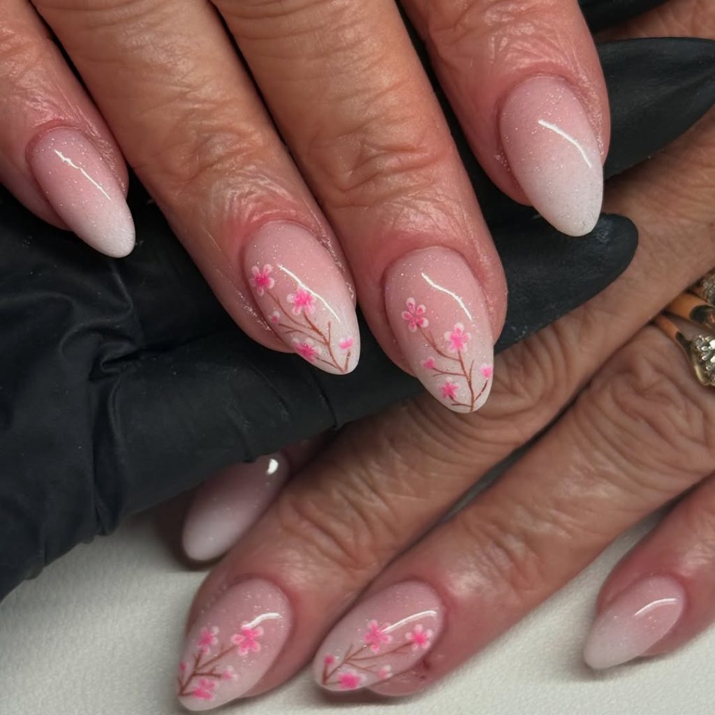 A translucent pink gradually fades to delicate white ombre with a fine glimmer, finished by dainty branch florals. The short-to-medium almond length is not only cute; it’s also easy to maintain during busy weeks.