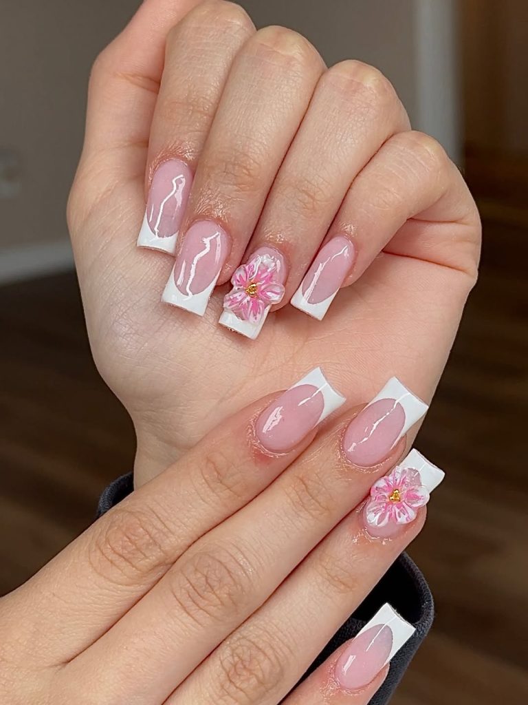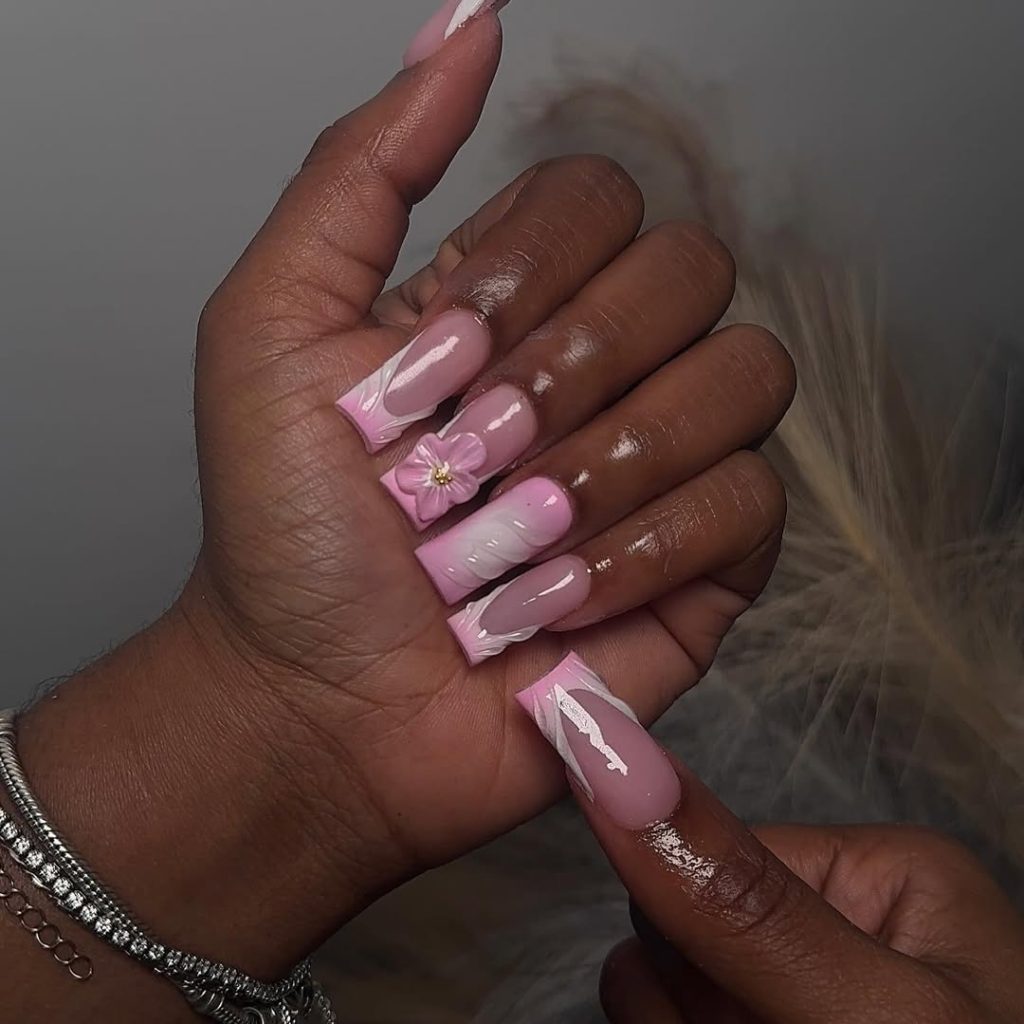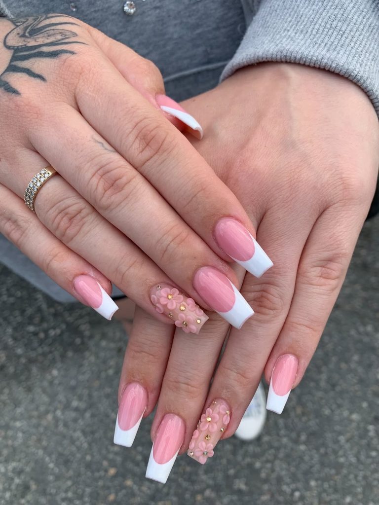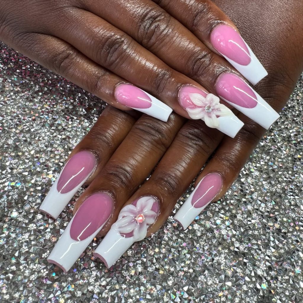 Think classic statement: elongated pink bases topped with bold white tips and a single sculpted blossom at the center. The elongated smile lines flatter both oval and square lengths, creating a sleek, editorial finish.