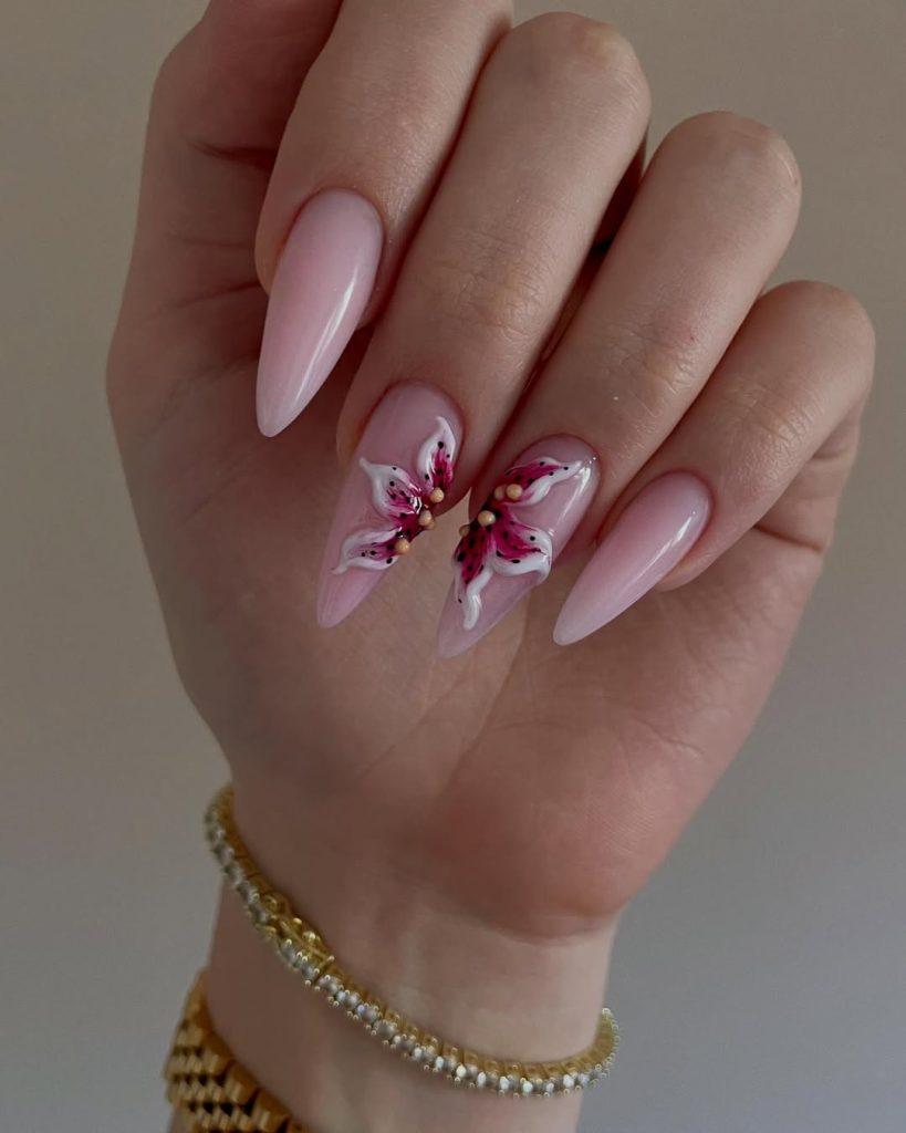Delicate baby-pink Almond nails meet a pair of raised lilies that stretch across two center nails—thin white petals kissed with raspberry dots and gilded micro beads. The rest stay sheer and glossy so the floral art feels airy and light, not heavy.