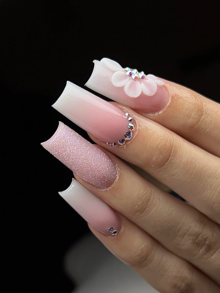 A seamless pink-to-white ombre meets three different lux touches: a velvet glitter nail, a daisy relief with crystal stamens, and rhinestone arcs that trace the cuticle. The square-tapered silhouette keeps the look clean.