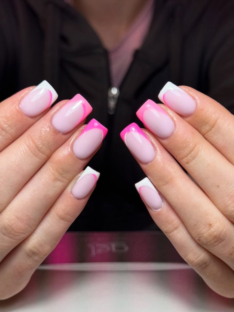 A playful take on tradition: Neon pink and white corners create a color-blocked French tip look on top of milky pink. A short square length keeps it commuter-proof; the sharp edges ensure the color palette is deliberate, not juvenile.