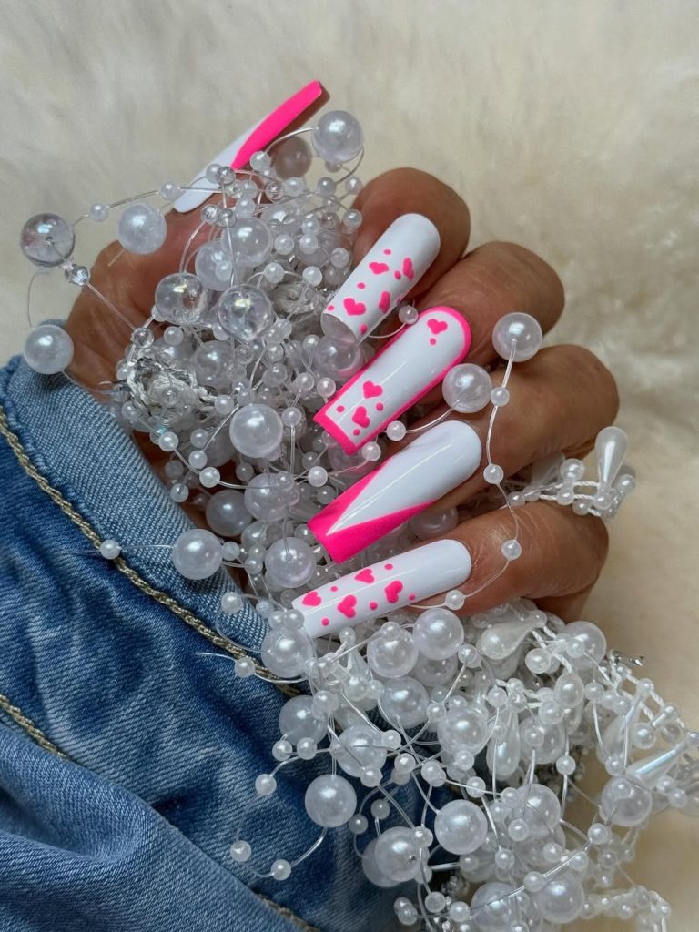 For the bold: glossy snow-white tips with a razor-thin pink stripe and scattered neon hearts. The long length and squared edges are unapologetically fun—Valentine’s energy you can wear in July.
