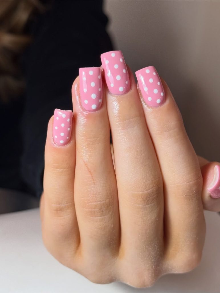 Candy-pink lacquer sprinkled with tidy white dots on a short, softly square shape. It’s the manicure equivalent of a tennis skirt—sporty, cute, and completely wearable.