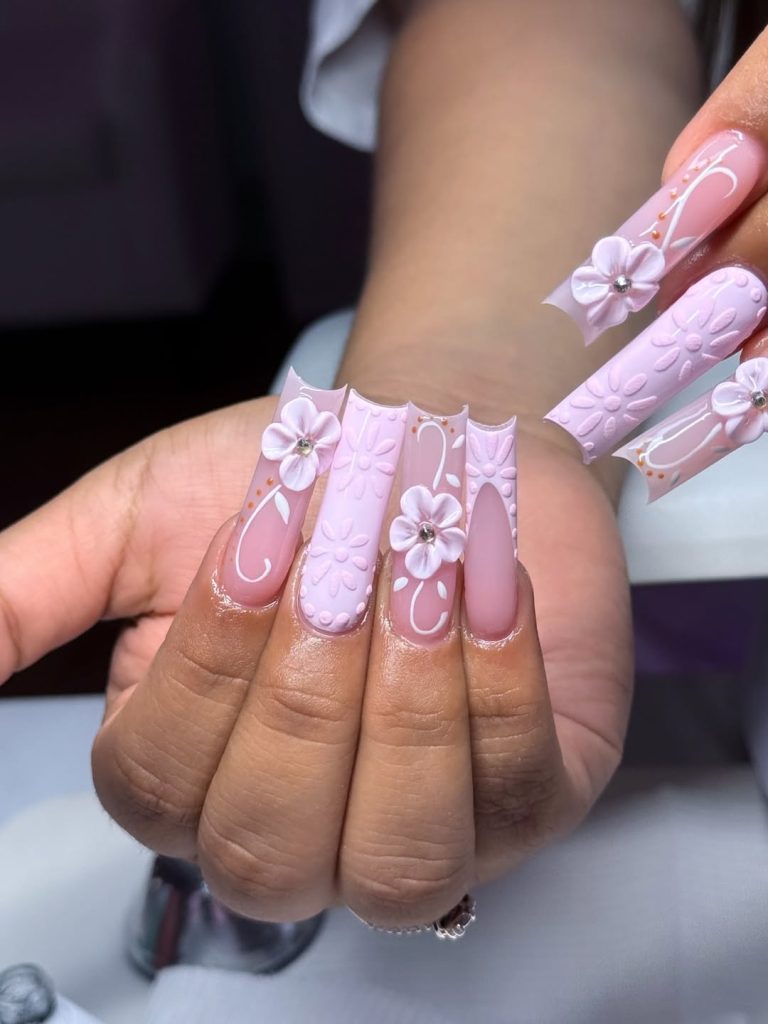 Long blush nails have glossy sections alternating with flat, embossed floral detailing and white line work. Two statement flowers inject serious art patterns with high.
