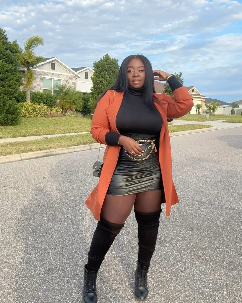 A tangerine coat, black turtleneck, and leather mini skirt deliver a sharp, powerful outfit that’s made for Black women with a bold fashion sense.