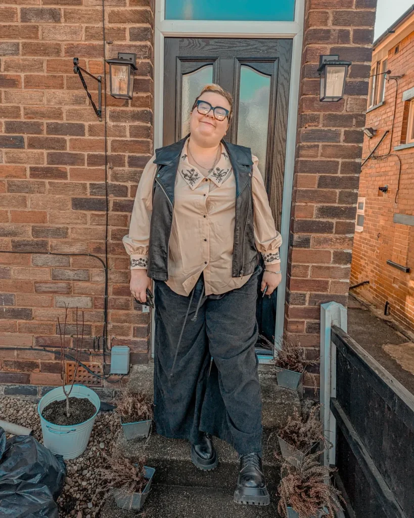 Using a folk-style embroidered blouse, paired with a faux-leather vest along with wide-leg trousers, makes for an Alt outfit that captures the vibe of a cozy cottagecore-city fusion.