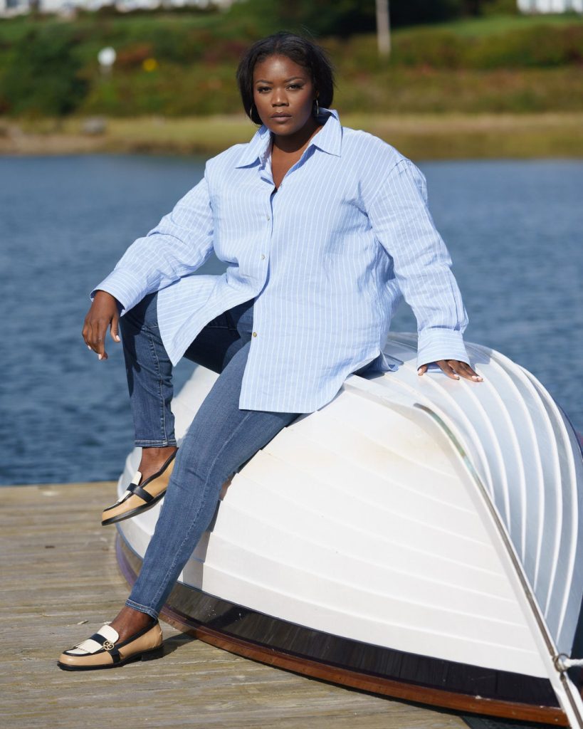 Imagine wearing this on a dockside brunch, a quick day trip, or casual Fridays that border on business formal in a relaxed office. The long shirt offers gentle coverage over an apron stomach while still feeling sharp—great if you love summer modest silhouettes that don’t scream “cover-up.” To personalize it, roll the sleeves, add a striped tote, or throw on a red lip for a subtle maritime nod. Avoid overly chunky sneakers here; the loafer keeps the line clean and elongates the leg. It’s the kind of casual, curvy OOTD look you’ll repeat all season.