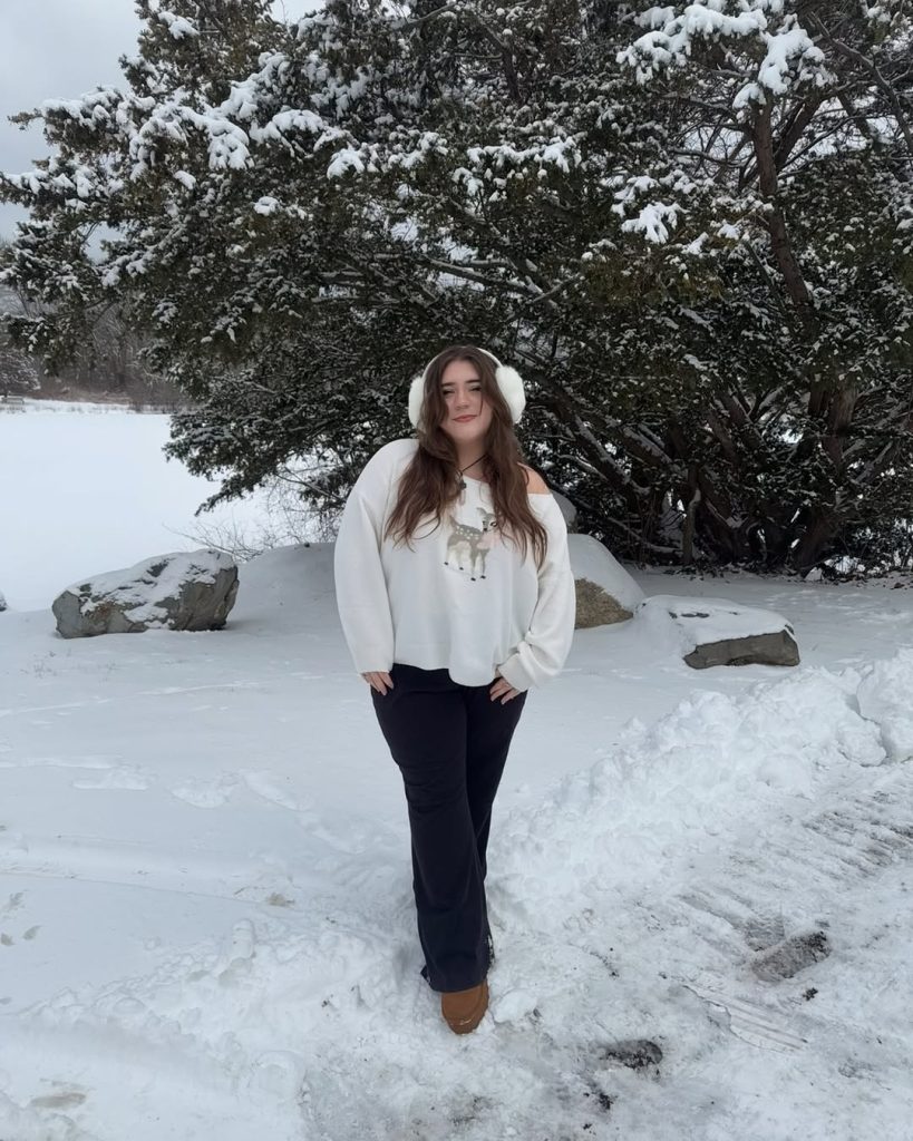 A soft graphic sweater, flared pants, and fluffy earmuffs make a quietly playful Winter 2026 look that’s as cozy as a weekend cabin trip.