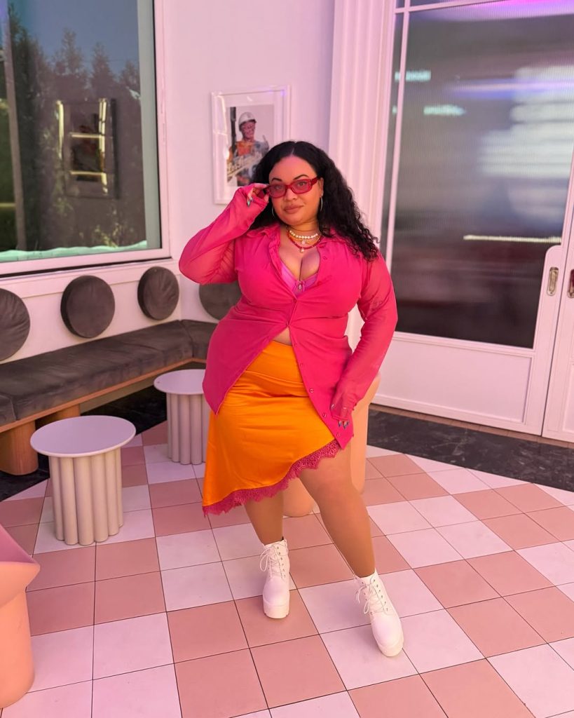 This look is a dream for summer nights out for drinks, rooftop parties, or birthday dinners where you want the room to notice. You could add a cropped blazer in fuchsia for more polish or a metallic clutch for extra shine. Steer clear of dark tights or heavy jackets; they would mute the joy of the color mix. Think of it as your power-suit alternative for plus-size outfits 2026 ideas that refuse to blend in.