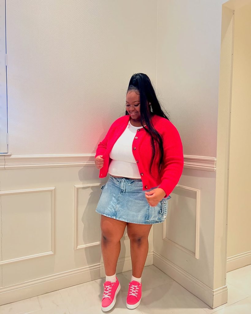 This outfit exists for summer mall hangs, bowling nights, or movie dates when you want to feel put together but still playful. Add a tiny shoulder bag in white or pink, plus a pair of small hoop earrings to tie it all together. Avoid heavy belts or bulky jackets that cut across the hips; the charm here is the clean line from cropped cardi to mini skirt, which celebrates curves for women who love color.